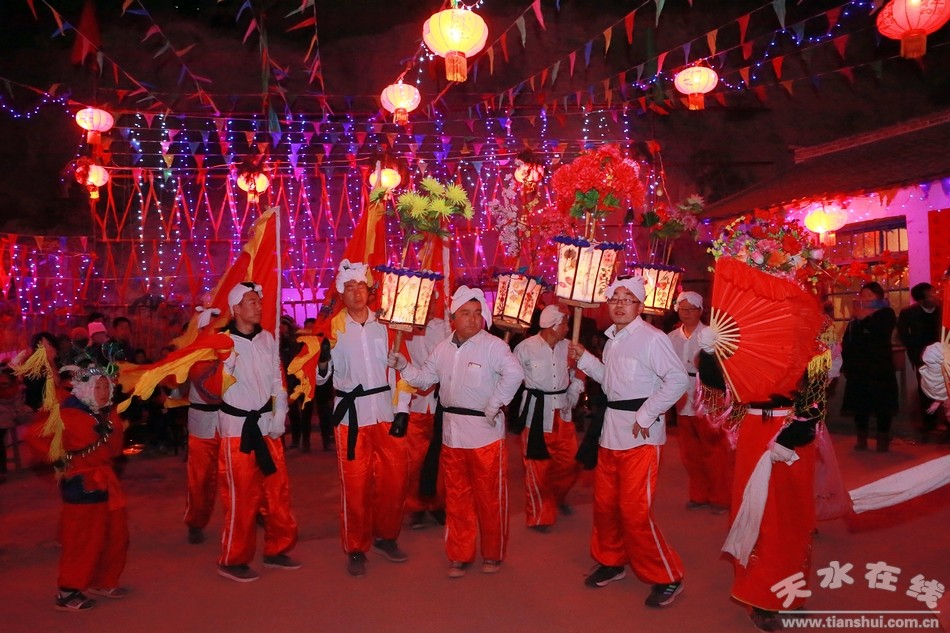 2月13日,武山县山丹镇丁湾村村民耍起夜社火过大年。