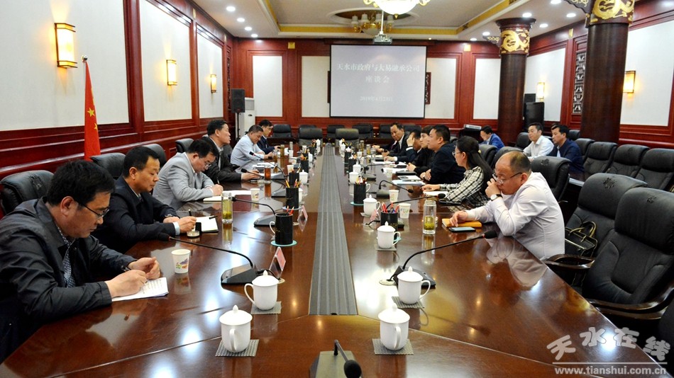 4月23日,天水市委副书记、市长王军主持召开座谈会,就天水市政府与大易融承(北京)投资公司开展文化旅游项目合作事宜进行深入磋商洽谈。