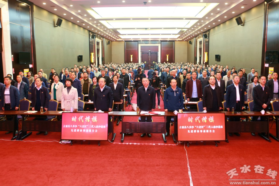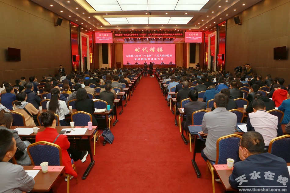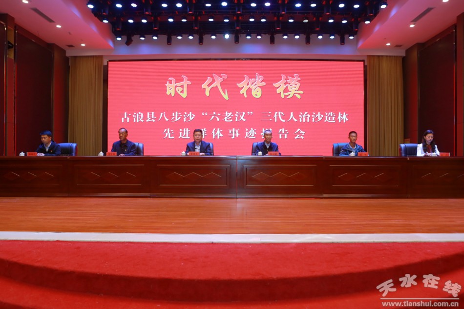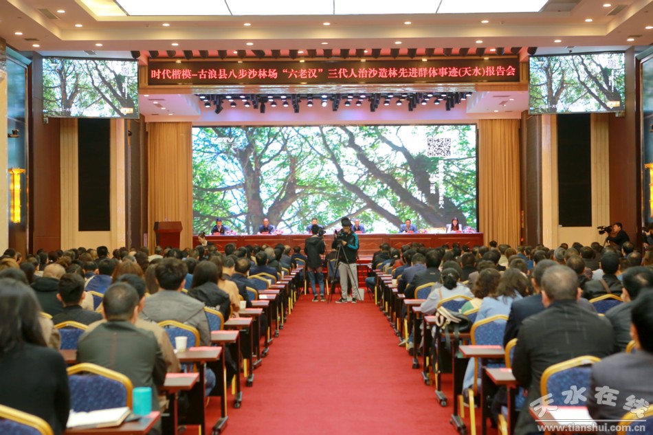 (5月8日上午,“时代楷模”古浪县八步沙林场“六老汉”三代人治沙造林先进群体事迹报告会在天水宾馆举行。)