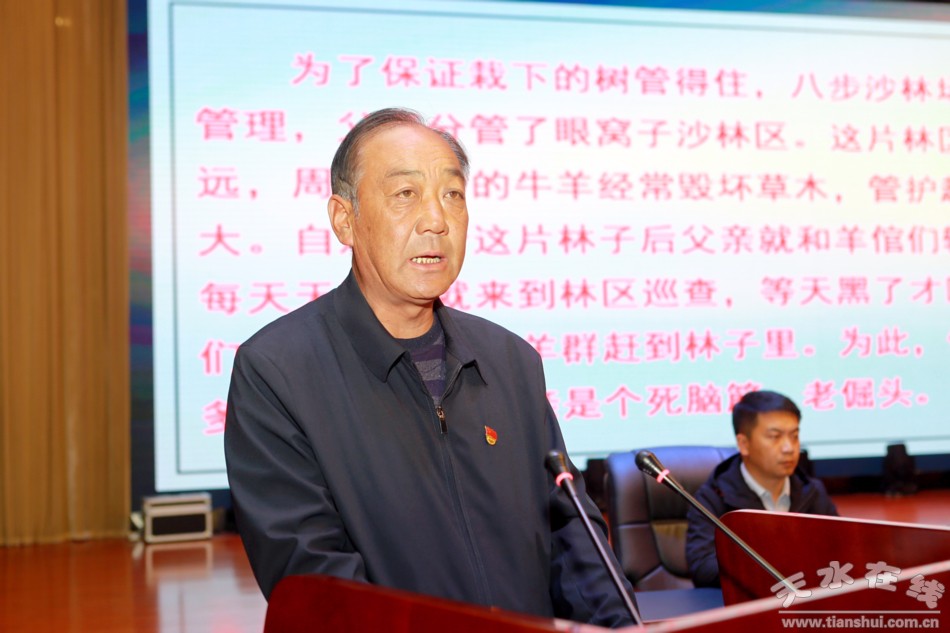 市委常委、市委宣传部部长张建杰主持报告会,他强调,全市上下要以古浪县八步沙林场“六老汉”三代人治沙造林先进群体为榜样,学习他们勇挑重任、护卫家园的担当精神,充分发挥共产党员的先锋模范作用,在重要关头勇挑重任,吃苦在前、奋战在先,在平凡的岗位上努力创造不平凡的业绩;要学习他们不畏艰难、实干苦干的拼搏精神,撸起袖子加油干,一步一个脚印把各项工作推向前进;要学习他们勇于探索、唯实创新的进取精神,破解我市改革发展难题,推动高质量发展;要学习他们矢志坚守、接续奋斗的愚公精神,一张蓝图绘到底,全心全力促发展,在一代又一代人的接续奋斗中,书写好实现中国梦的恢弘篇章。