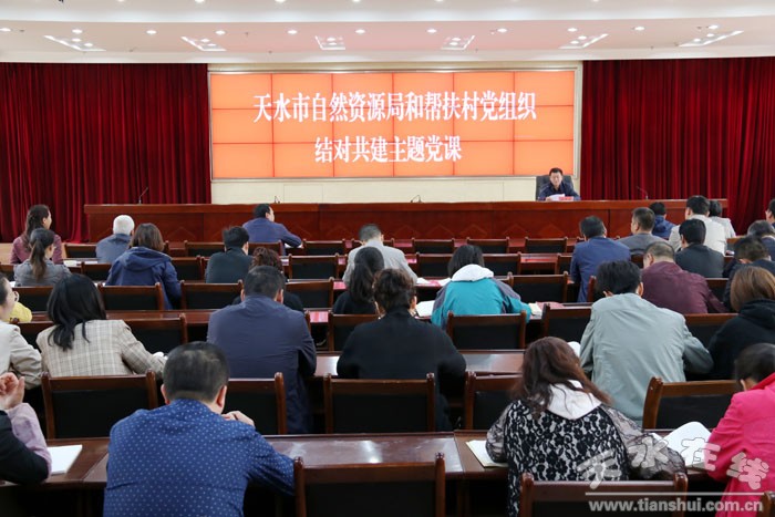 为深入学习贯彻习近平总书记扶贫重要论述,扎实推进脱贫攻坚,进一步提升贫困村党组织组织力,根据省、市委组织部《关于扎实做好帮扶单位党组织与贫困村党组织结对共建工作的通知》要求,5月10日下午,天水市自然资源局与帮扶村党组织开展了结对共建“主题党日”活动,邀请武山县温泉镇杜沟村、大坪村驻村第一书记韩志乐、靳荣和温泉镇党建办主任宋丽娜同志为全局党员干部上了一堂特殊党课。市自然资源局60余名党员干部参加了会议。