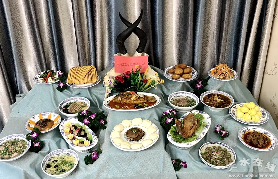 天水回族风情十三花顾名思义是由十三道精美可口的菜肴组成。内容丰富,营养价值高,荤素搭配均匀,主要以西风风味,以牛羊肉为主,彰显清真菜独特魅力。不仅从总体上保持了阿拉伯和波斯饮食文化的风味特点,而且结合了天水清真菜优点。现在天水清真菜,主要以牛羊鸡鱼等食材,结合川、粤、鲁和淮阳菜等菜系制作手法,使清真菜在天水特色菜品中一枝独秀。