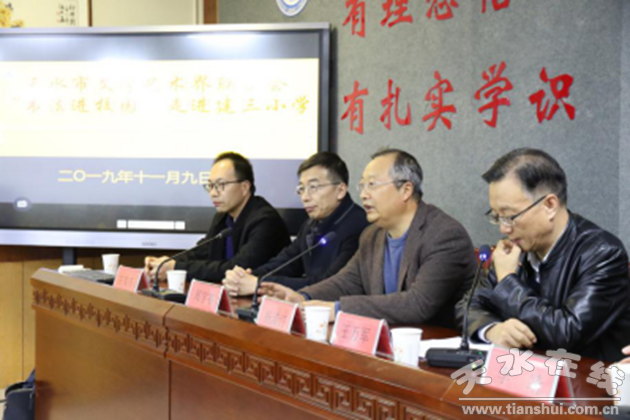 11月9日上午,天水市文联“书法进校园”活动在天水市建三小学隆重举行。此次活动由市文联党组书记、主席、省书法家协会副主席杨清汀带队,市书法家协会主席周宇春,天水市书画院院长、市书法家协会副主席李靖,秦州区文联主席左昊苏,市书法家协会副主席陈安祥,市书法家协会顾问谢荣生以及书法家王永斌、闫五权、赵志强、杨新国、张杰等参加活动。