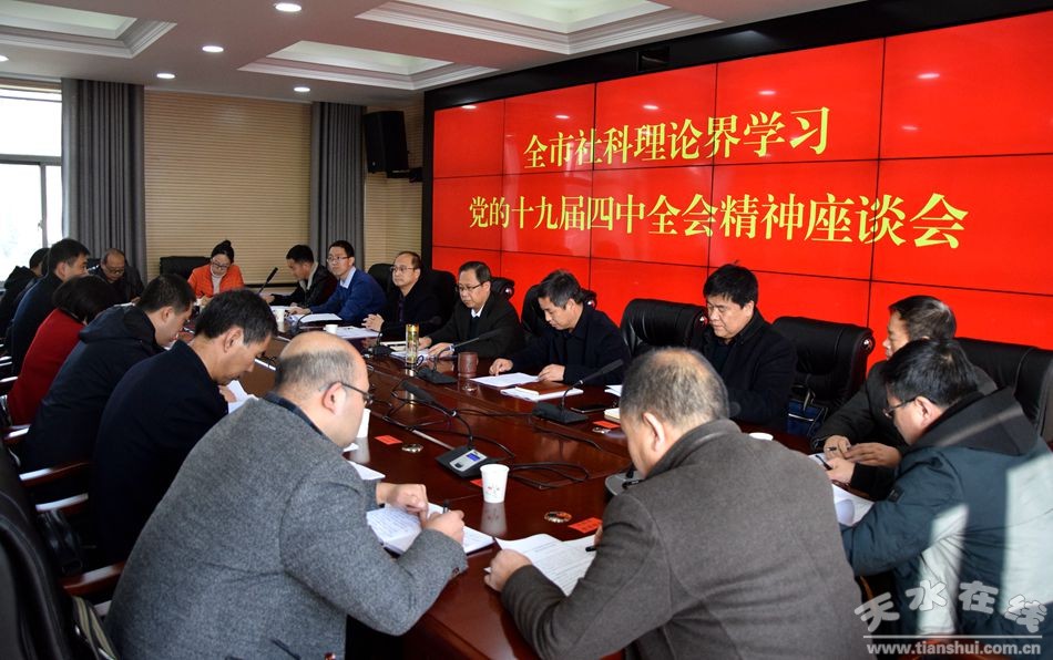 座谈会上,市委研究室、天水师范学院、市委党校、市科技局、武山县委宣传部、天水日报社、市哲学学会、张家川县委宣传部负责人分别围绕党的十九届四中全会精神重点内容作了交流发言。