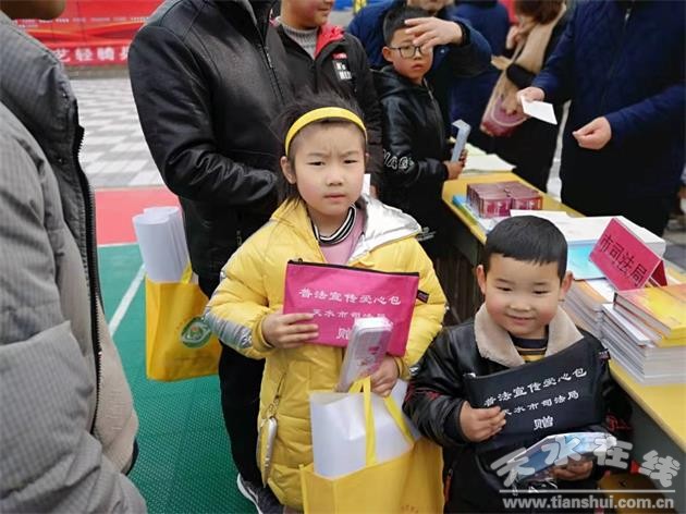 活动现场,天水市司法局充分发挥职能优势,把开展“法律进乡村”活动作为贯彻落实党的十九届四中全会精神、推动实施乡村振兴战略全面实施、加快推进农业农村现代化,采取群众喜闻乐见、易于接受的形式,组织开展了宪法、法律进乡村、扫黑除恶、法律服务咨询等活动。“送法下乡”小分队通过设立咨询台、摆放宣传版面、发放宣传资料、“普法宣传爱心包”(铅笔盒、中性笔、法律援助及农村法律问答折页)、接待群众咨询的方式,重点宣传了宪法、劳动法、土地承包法、婚姻法、人民调解法、社区矫正法等与农村广大干部群众密切相关的法律法规。活动现场,发放宪法宣传读本500本、人民调解法宣传书籍100本、农村法律书籍100余册,普法宣传爱心包300个,普法宣传袋500个、法治扑克200幅、纸杯500个,接待群众现场咨询200余人次。