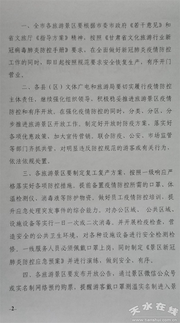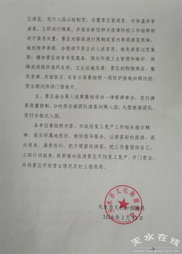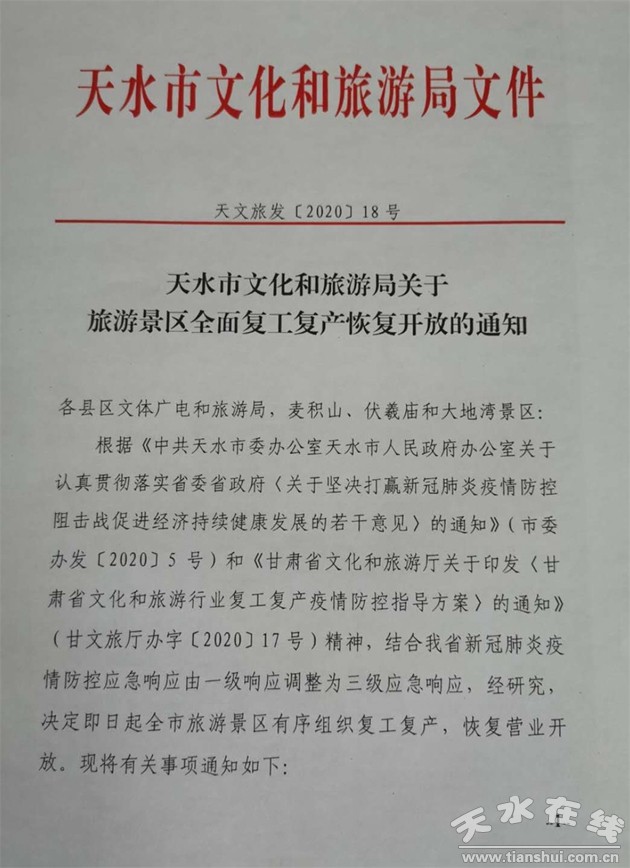 2月22日,为切实加强天水市各旅游景区疫情科学防控,结合我省新冠肺炎疫情防控应急响应由一级响应调整为三级响应,经市文旅局评估研判,决定即日起全市旅游景区有序组织复工复产,恢复营业开放。