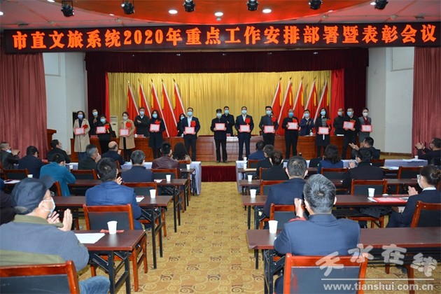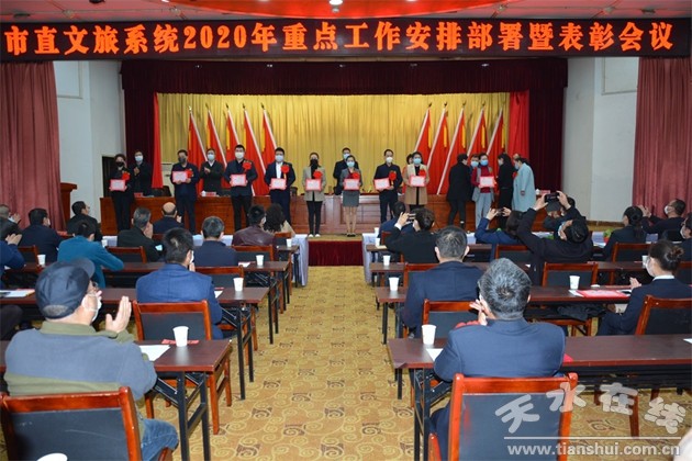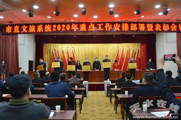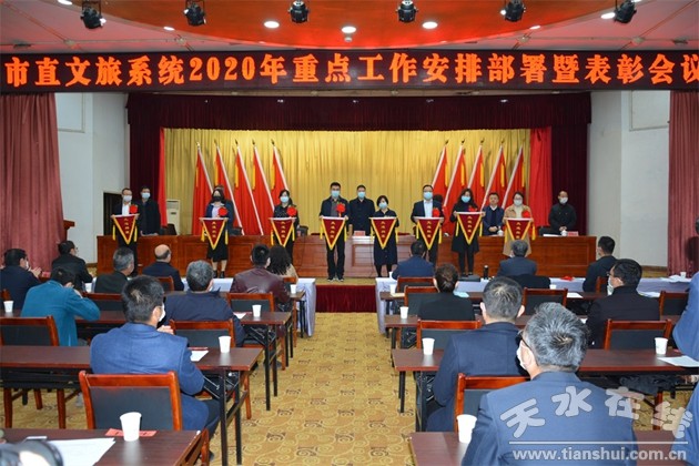 3月20日上午,天水市文化和旅游局在市迎宾馆召开市直文旅系统2020年重点工作安排部署暨表彰会议。局党组书记、局长李玉进出席会议并讲话,副局长李小敏通报2019年度考核情况,副局长刘宗林宣读表彰名单。副局长杨春晓主持会议。