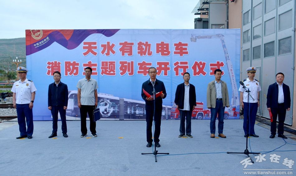 6月8日,天水有轨电车消防主题列车开行仪式举行。该主题列车开行旨在广泛发动社会各界关注参与消防工作,宣传普及消防知识,增强消防安全意识,创造消防安全环境,不断提升全社会抗御火灾的能力。副市长董小平出席开行仪式并讲话。
