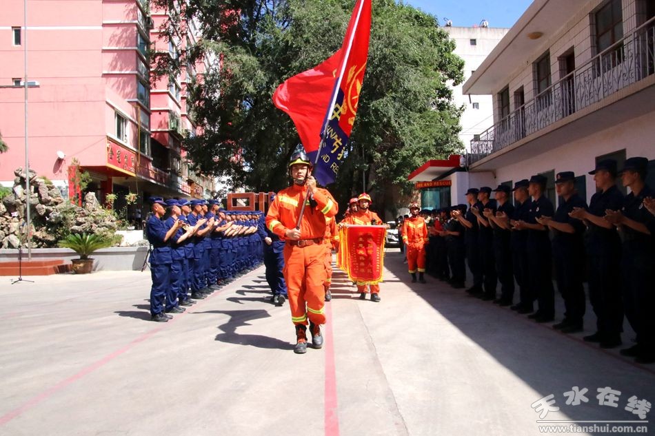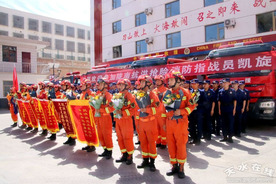 “支队长同志,赴陇南参加抗洪救灾30名指战员圆满完成任务,安全顺利返回。”9月2日下午14时,天水市消防救援支队奉命执行任务的人员车辆安全顺利到达天水。支队举行仪式欢迎增援陇南抗洪指战员光荣凯旋。特勤消防站院内,锣鼓声声,掌声不断,支队在队全体指战员及家属代表参加仪式。仪式由支队长牛小强主持。