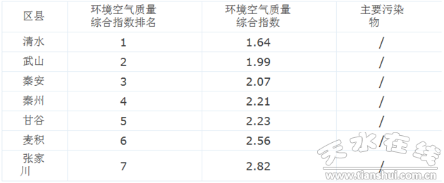 8月份,各县区环境空气质量排名由好到差分别为:清水县1.64、武山县1.99、秦安县2.07、秦州区2.21、甘谷县2.23、麦积区2.56、张家川县2.82。