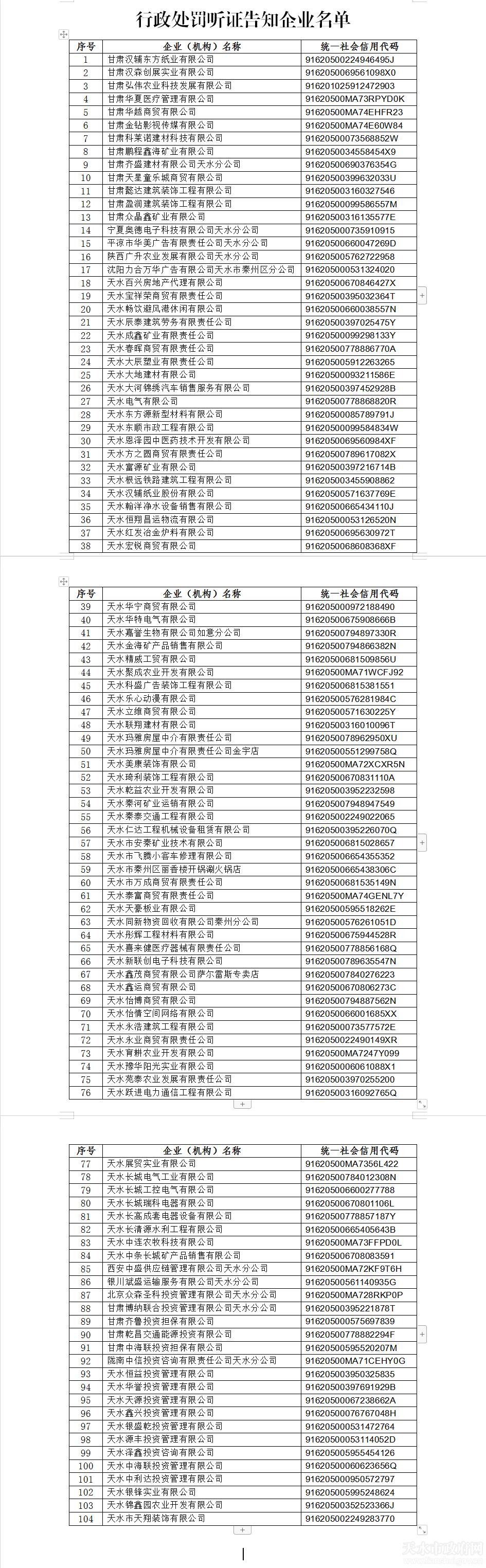 近日,天水市市场监管局发布《行政处罚听证告知公告》拟吊销甘肃汉铺东方纸业有限公司等104户企业营业执照。