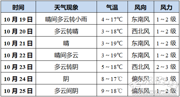 受较强冷空气影响,19-22日我市最低气温明显下降,昼夜温差加大,其中19日夜间全市有明显降雨天气,高海拔山区有雨夹雪或雪,提醒广大市民朋友注意防寒保暖,谨防感冒。