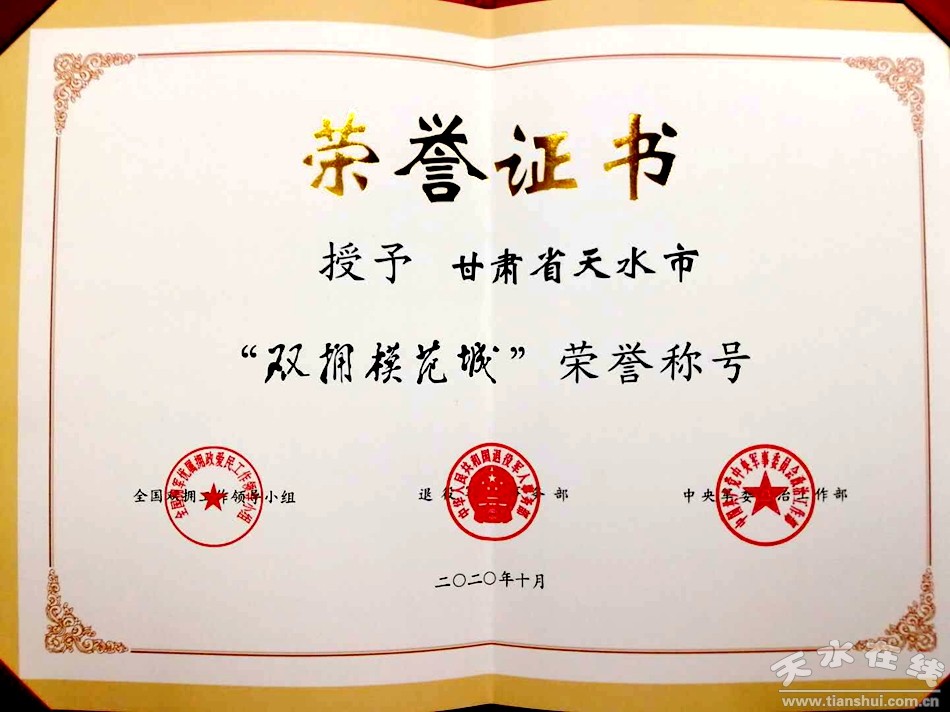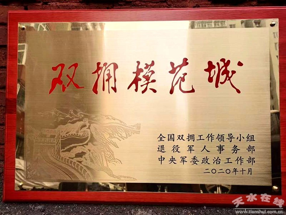 大会宣读了关于命名411个全国双拥模范城(县),关于表彰全国爱国拥军模范单位和拥政爱民模范单位,关于表彰全国爱国拥军模范和拥政爱民模范的决定。向受到命名表彰的全国双拥模范城(县)、双拥模范单位和个人代表颁奖。在受表彰的411个全国双拥模范城(县)名单位中,天水市名列其中,荣获全国双拥工作领导小组、退役军人事务部、中央军委政治工作部共同命名的“全国双拥模范城”荣誉称号,这是天水市连续第六次获得全国双拥模范城殊荣,实现了全国双拥模范城“六连冠”。