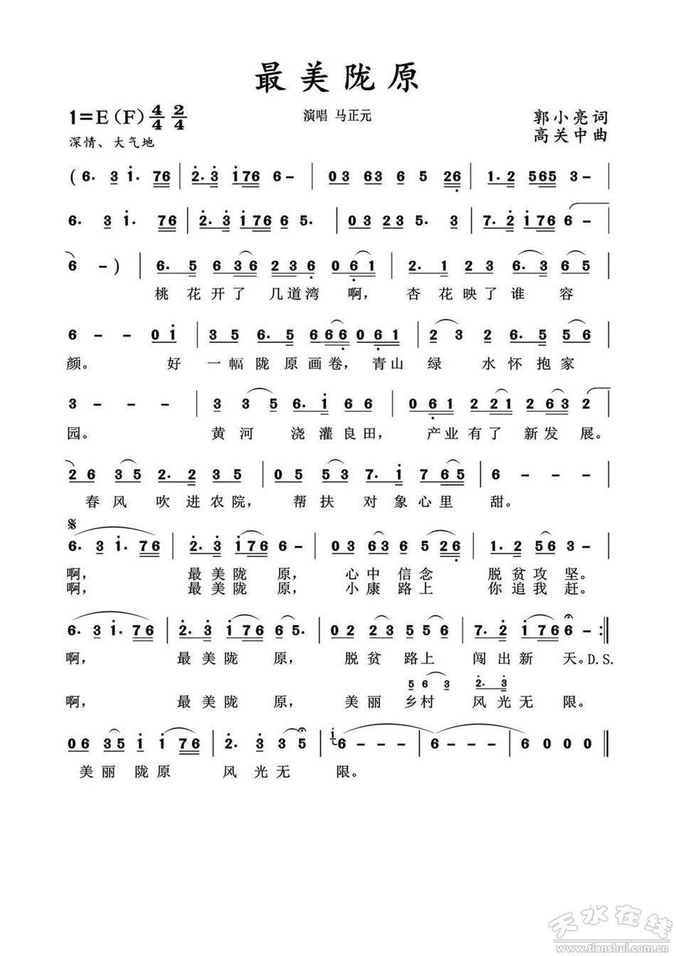 《最美陇原》词、曲、原歌演唱者郭小亮、高关中、马正元都是天水籍人士,他们亲身感受和目睹了党的扶贫攻坚富民、惠民政策实施以来,陇原大地上发生的历史性巨变,以音乐的形式,紧扣时代脉搏,讴歌了扶贫攻坚这一伟大实践,唱出了陇原人民的心声,唱出了新时期新农村的新变化,是一首反映时代,贴近生活的优秀音乐作品。《最美陇原》唱响了天水,也唱响了陇原大地,充满了艺术的感染力和震撼力,给人以希望和鼓舞。