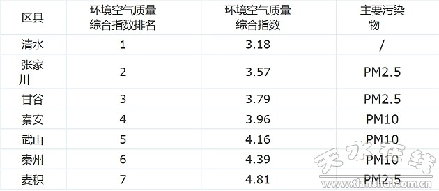 11月份,各县区环境空气质量排名由好到差分别为:清水县3.18、张家川县3.57、甘谷县3.79、秦安县3.96、武山县4.16、秦州区4.39、麦积区4.81。