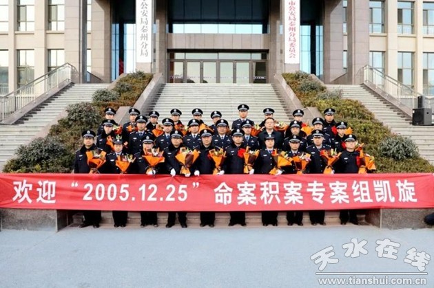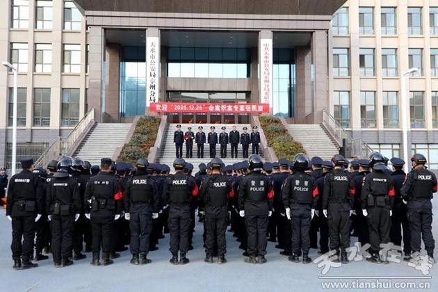 12月24日,市、区两级公安机关在天水市公安局秦州分局举行欢迎仪式,迎接秦州分局“2005.12.25”命案积案专案组凯旋。副市长、市公安局党委书记、局长郭庆祥出席欢迎仪式并讲话,市公安局党委副书记、常务副局长乔振华宣读了市公安局《贺电》,市公安局党委委员、副局长李世和宣读了省公安厅刑警总队《贺电》,秦州区委常委、政法委书记何炜巍向专案组民警献花,欢迎仪式由秦州区副区长、公安分局党委书记、局长马小军主持。市公安局刑警支队、办公室等部门负责人和秦州分局党委班子成员、民警代表参加欢迎仪式。