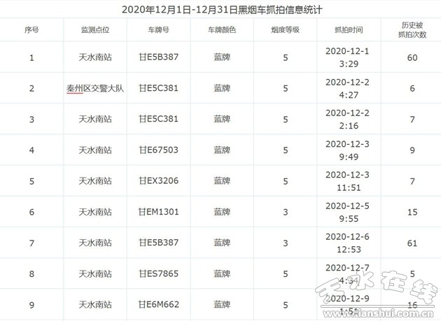 依据《中华人民共和国大气污染防治法》《甘肃省大气污染防治条例》等法律法规,现将2020年12月1日—31日全市机动车尾气抓拍系统抓拍的黑烟车辆(名单附后)信息予以曝光。请相关单位、机动车所有人严格按照机动车尾气排放标准要求,于1月20日前,对黑烟车辆进行维修检测,确保达标排放;逾期未完成维修检测,再次驾驶不合格车辆上路行驶的,市生态环境局、市公安局交警支队将依法进行处罚。
