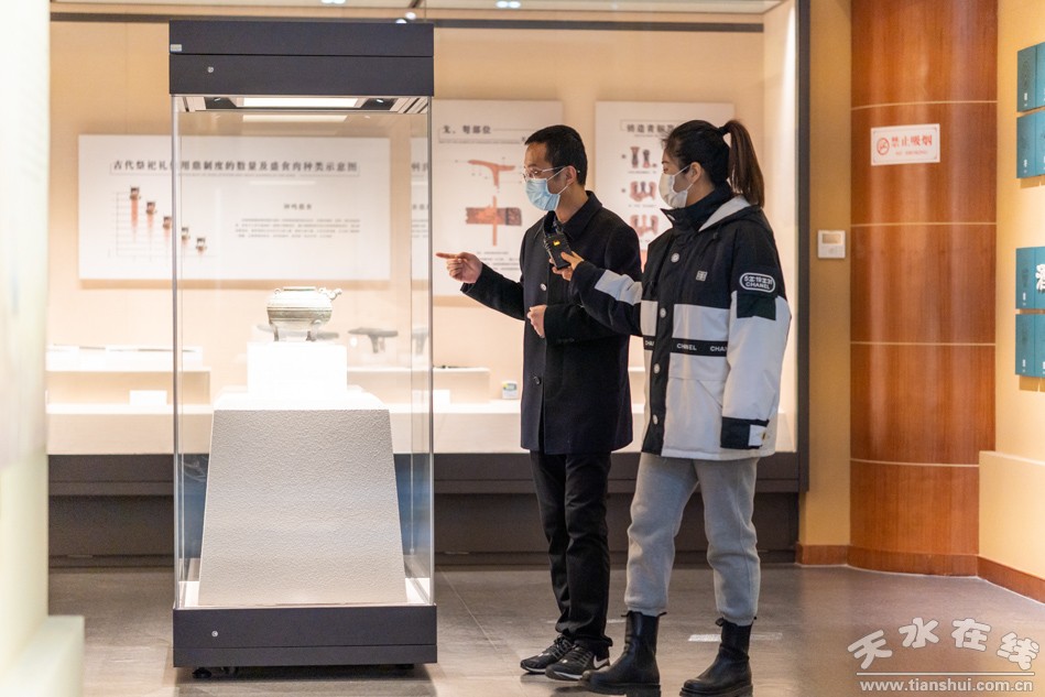 (麦积区博物馆馆长黄伟民向天水在线主播萌萌介绍展品)