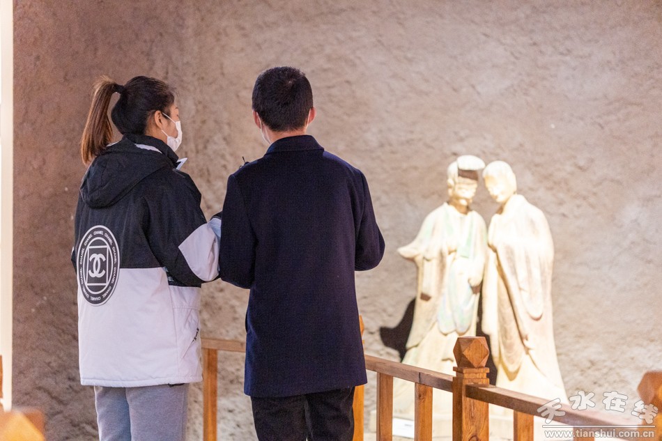 (麦积区博物馆馆长黄伟民向天水在线主播萌萌介绍展览情况)