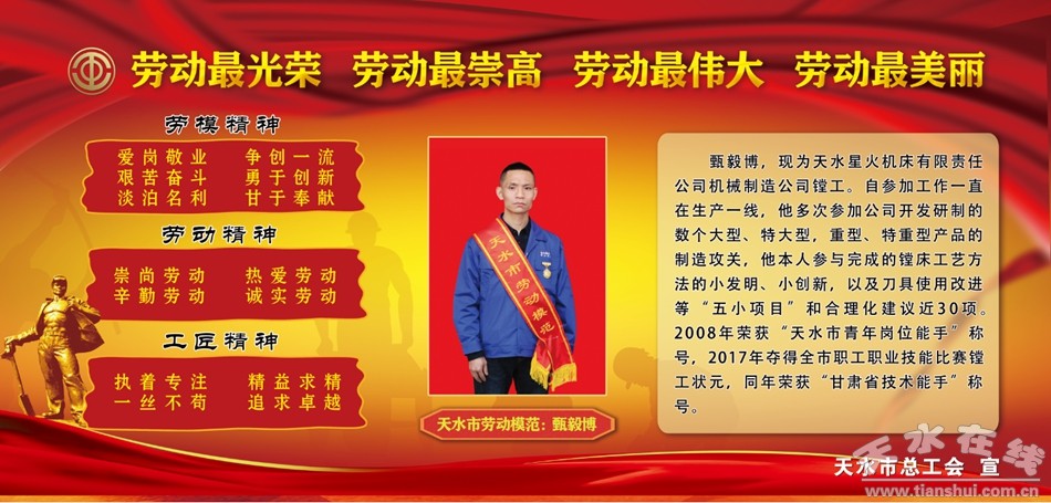 甄毅博,现为天水星火机床有限责任公司机械制造公司镗工。自参加工作一直在生产一线,他多次参加公司开发研制的数个大型、特大型,重型、特重型产品的制造攻关,他本人参与完成的镗床工艺方法的小发明、小创新,以及刀具使用改进等“五小项目”和合理化建议近30项。2008年荣获“天水市青年岗位能手”称号,2017年夺得全市职工职业技能比赛镗工状元,同年荣获“甘肃省技术能手”称号。