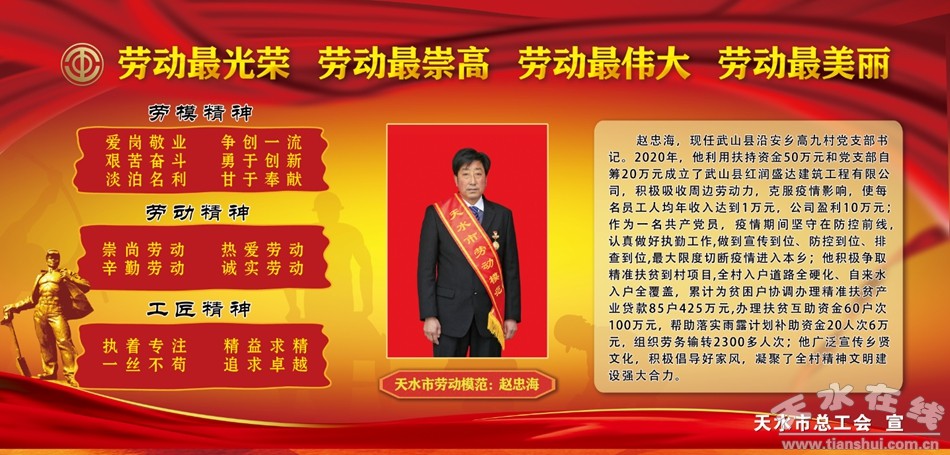 赵忠海,现任武山县沿安乡高九村党支部书记。2020年,他利用扶持资金50万元和党支部自筹20万元成立了武山县红润盛达建筑工程有限公司,积极吸收周边劳动力,克服疫情影响,使每名员工人均年收入达到1万元,公司盈利10万元;作为一名共产党员,疫情期间坚守在防控前线,认真做好执勤工作,做到宣传到位、防控到位、排查到位,最大限度切断疫情进入本乡;他积极争取精准扶贫到村项目,全村入户道路全硬化、自来水入户全覆盖,累计为贫困户协调办理精准扶贫产业贷款85户425万元,办理扶贫互助资金60户次100万元,帮助落实雨露计划补助资金20人次6万元,组织劳务输转2300多人次;他广泛宣传乡贤文化,积极倡导好家风,凝聚了全村精神文明建设强大合力。