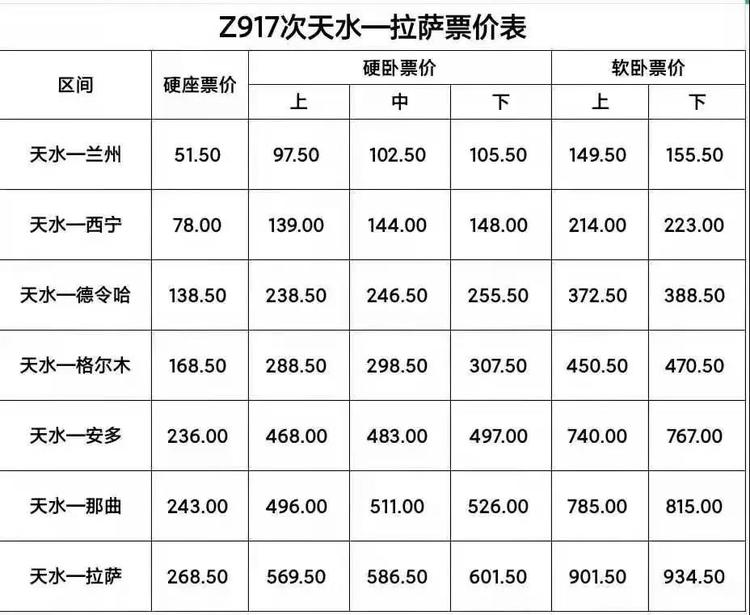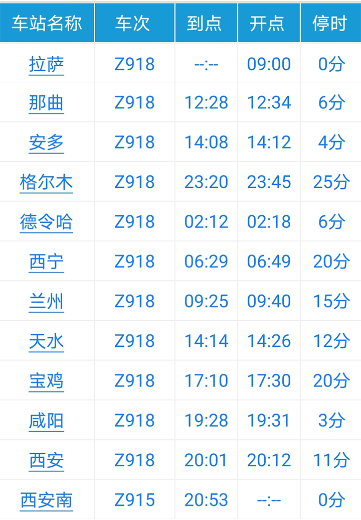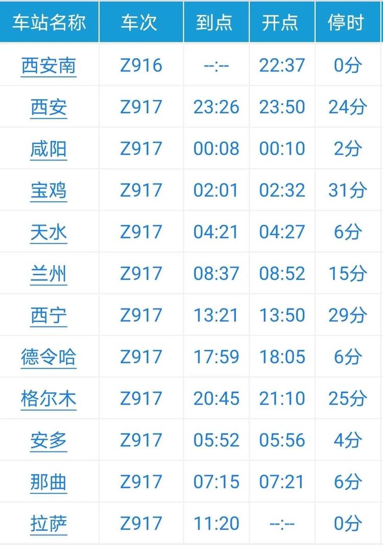 自6月19日起西安南至拉萨隔日加开Z917列车,西安南站22:37始发,途中停靠西安、咸阳、宝鸡、天水、兰州、西宁、德令哈、格尔木、安多、那曲,次日11:20终到拉萨,历时35小时30分钟。自6月20日起Z918次拉萨09:00始发,次日20:53终到西安南站,历时35小时53分钟。