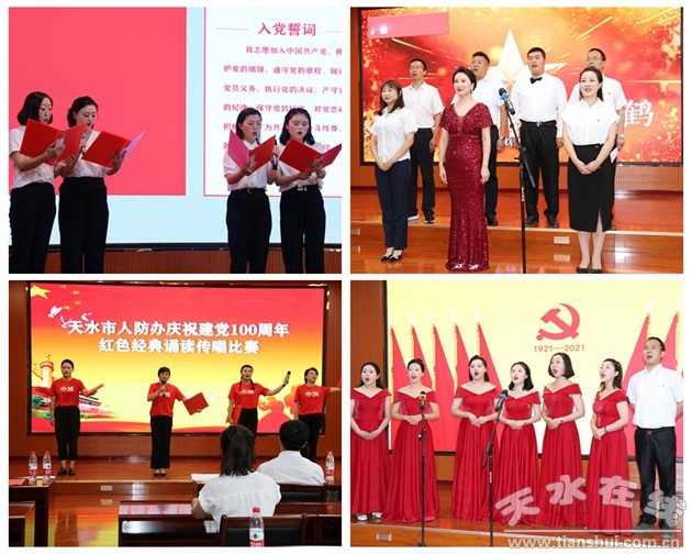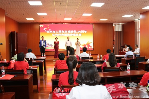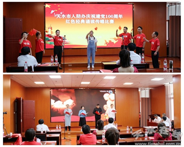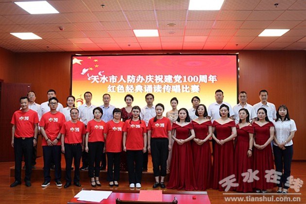 深情诵唱礼赞丰功伟绩,党旗飘扬引领未来辉煌。6月25日,天水市人防办举行“传承红色基因、赓续精神血脉、凝聚奋进力量”红色经典传唱诵读比赛,庆祝党的百年华诞,回顾党的奋斗历程,讴歌党的丰功伟绩,牢记党的初心使命。市人防办党组书记、主任王志军,党组成员、副主任王永第和蔡向增,以及全体党员干部职工参加与观看了诵读比赛。