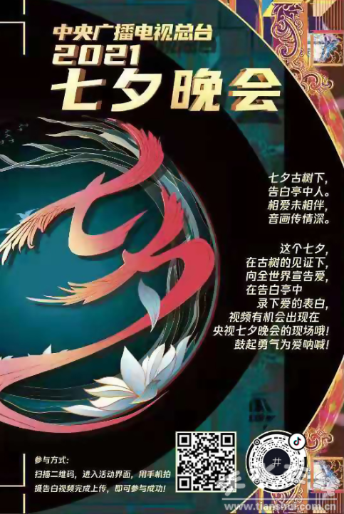 8月14日是农历七夕,是中国最具浪漫色彩的传统节日,在当代更是产生了“中国情人节”的文化含义。浪漫的节日就应该有浪漫的告白和度过方式,在七夕节来临之际由中央广播电视总台主办的“七夕晚会”,旨在弘扬七夕佳节的优良传统、民俗文化,引导广大群众积极参与体验七夕节日习俗、展现中国精神、增进文化自信,焕发爱党爱国爱社会主义的巨大热情。此次晚会以光为引,以爱为名,通过“爱•自有光”的主题传达出七夕佳节恋人之间浓情目光中纯真的爱、传承至今华夏文明之光中真挚的爱以及建党百年璀璨荣光中炽热的爱。