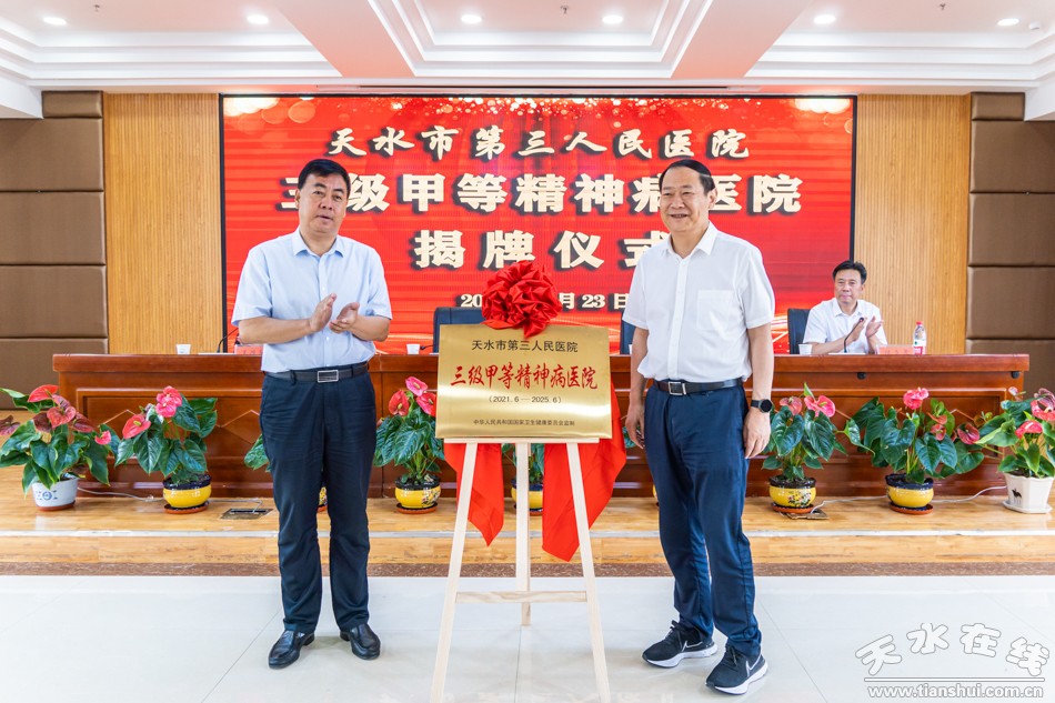 7月23日,天水市第三人民医院举行“三级甲等”精神病医院揭牌仪式。市三院成功晋升为全省首家“三级甲等”精神病医院。省卫健委副主任张浩、天水市副市长逯克宗出席活动并揭牌。