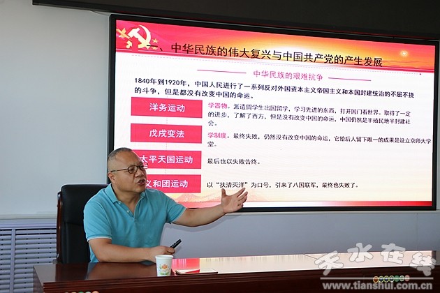 中共天水市委党校副教授王源远作了题为“铭记光辉历程 凝聚奋进力量”的专题讲座。另外,还学习了新民主主义革命时期历史、社会主义革命和建设时期历史、改革开放新时期历史、党的十八大以来的历史,认真研读《习近平论中国共产党历史》《毛泽东、邓小平、江泽民、胡锦涛关于中国共产党历史论述摘编》《中国共产党简史》等部分重要论述。