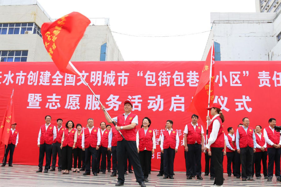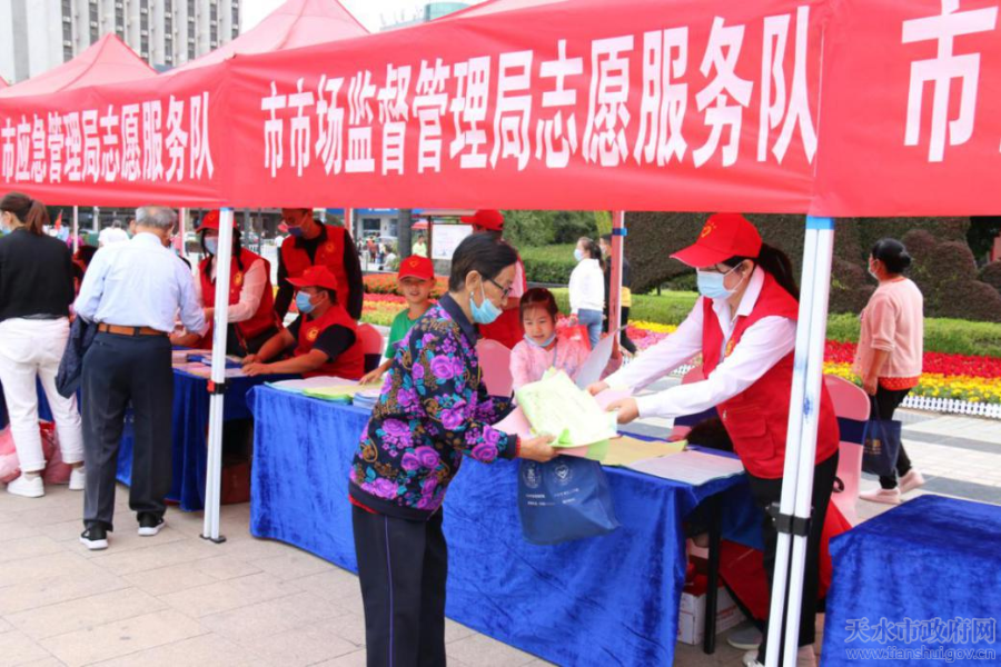 8月28日上午,天水市创建全国文明城市“包街包巷包小区”责任制落实暨志愿服务活动启动仪式在龙城广场举行,市四大组织全体领导出席,市委书记张永霞向秦州、麦积和市直21家部门单位授予天水市志愿服务队旗。市市场监管局党组书记、局长王宏玮代表市市场监管局志愿服务队领授队旗,局系统40多名干部职工参加了启动仪式,并依托启动仪式开展了食品、药品、特种设备和产品质量安全及消费维权等法律法规宣传工作。