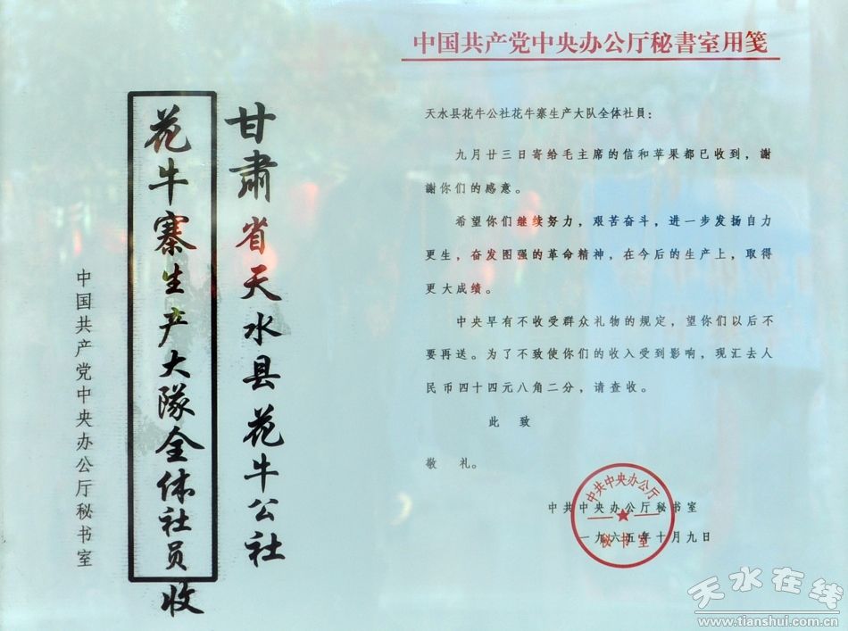 1965年,在香港国际博览会上,“花牛”苹果因其色度、果型、肉质、含糖等四项指标均优于美国“蛇果”而一举夺魁,享誉全球。这一消息传来,花牛村人都兴奋不已。当年9月23日,甘肃省天水县花牛寨生产大队的社员们精心挑选出两箱刚刚采摘的苹果给毛主席寄去,以表达对主席的敬仰之情,毛主席品尝后,非常喜爱,并在家中会见时任甘肃省省长的天水籍著名人士邓宝珊时用天水苹果招待他,称赞道:“你家乡天水的苹果好吃!”此后,中共中央办公厅代表毛主席向花牛村村民专门致函感谢,信中还夹寄了44.82元钱。花牛村将感谢信勒石树碑,永志纪念。