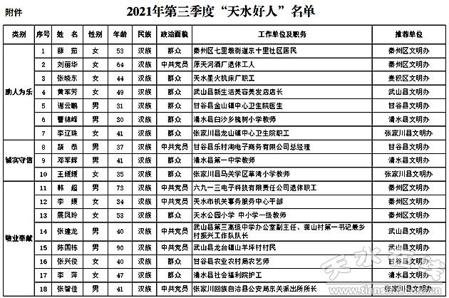 “天水好人”的评选由市文明办牵头,每季度评选一次。2021年第三季度,按照市文明办《关于组织开展“天水好人”推荐评选活动的通知》,各县区共推荐“助人为乐”“诚实守信”“敬业奉献”“孝老爱亲”四个类别“天水好人”候选人40人。市文明办邀请市委宣传部、市委直属机关工委、市总工会、团市委、市妇联、天水日报社、天水广播电视台等单位相关负责人组成评审委员会,于2021年9月29日召开会议进行了认真评审,确定薛茹等22人为2021年第三季度“天水好人”(名单见附件)。