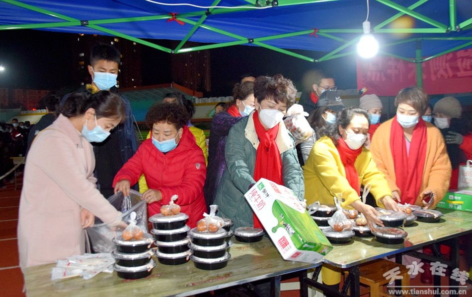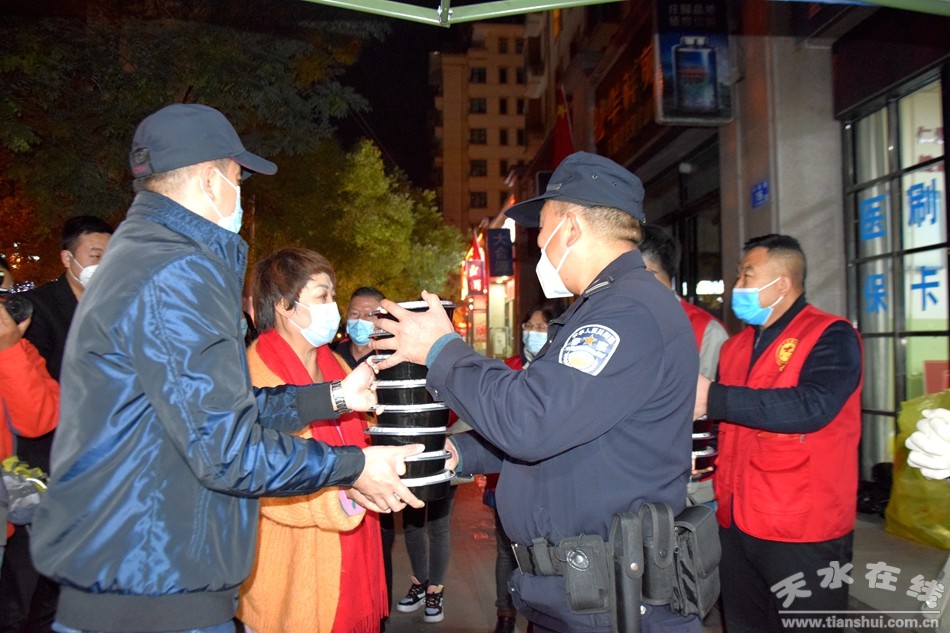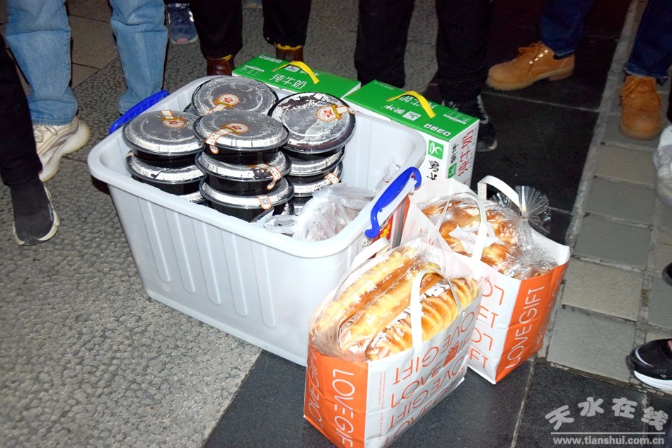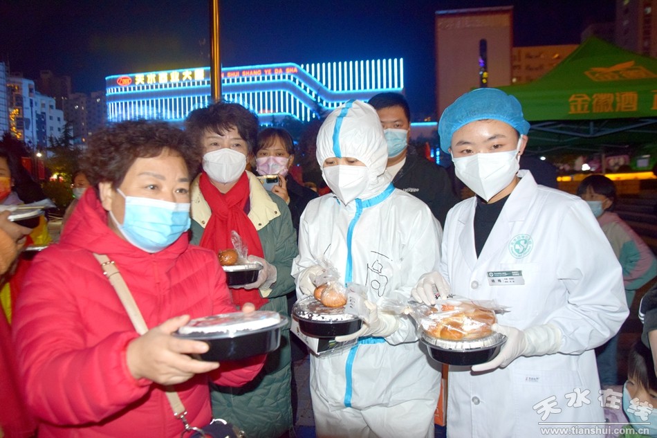 目前,我市疫情防控形势十分严峻,为抗击疫情,秦州区和麦积区开始进行大规模核酸检测。为助力防疫一线,10月24晚,我市“公益在行动,爱心在路上”公益团队组织爱心人士,积极筹措食物,对秦州区龙城广场、天庆嘉园、南山体育场、天水西出入口、伏羲中学5个核酸检测工作点送去夜宵180份,包括牛奶、面包、方便面、茶叶蛋、八宝粥、火腿肠等4千多元的食品,其中八宝粥和茶叶蛋由王娅萍女士带领员工亲自制作,为一线医护人员和志愿者送去了温暖。