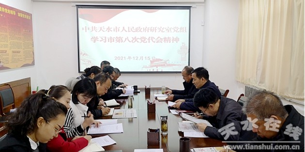12月15日上午,天水市人民政府研究室召开室党组理论学习中心组专题学习会议,传达学习中国共产党天水市第八次代表大会精神,研究部署贯彻落实工作。室班子成员参加会议,各调研员、各科室负责同志列席会议。