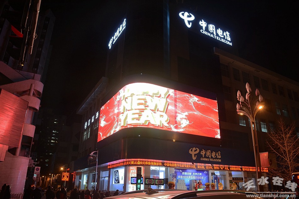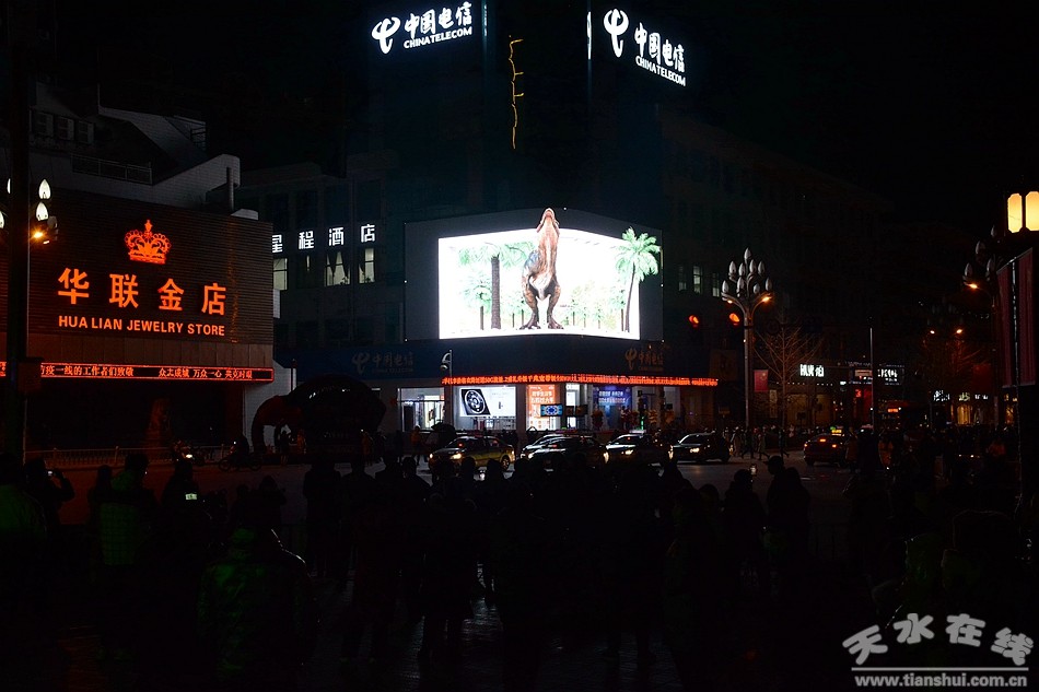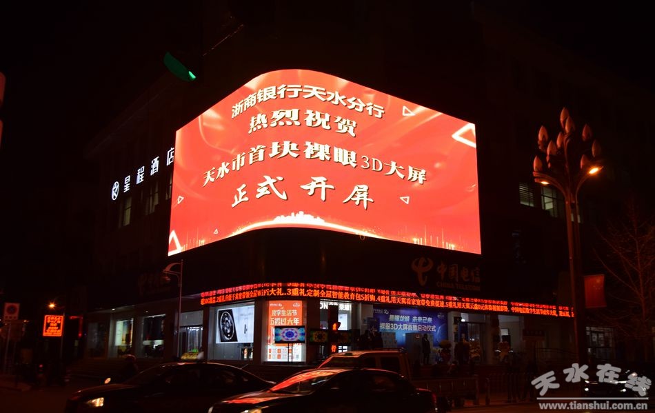 12月30日晚,天水电信隆重举行天水市首块裸眼3D大屏开播仪式。开播仪式结束后,位于龙城广场东北角的中国电信天水分公司通信大楼的裸眼3D大屏上滚动播出太空舰船、金龙缠绕和海底世界主题等精彩逼真的3D特效短片,现场吸引了大量游人驻足观赏拍照发抖音,记录下这一场视觉盛宴。
