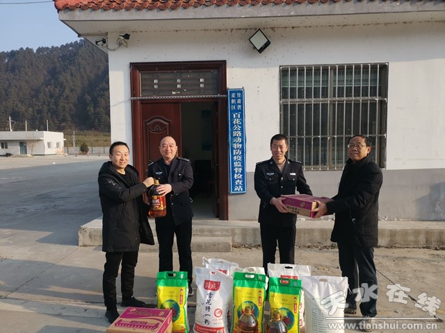 2月11日,天水市畜牧兽医局党组安排分管局长带领相关科室负责人专程赴麦积区东岔镇省级百花公路动物防疫监督检查站现场看望慰问干部职工,送去大米、面粉、食用油、方便面等慰问品。