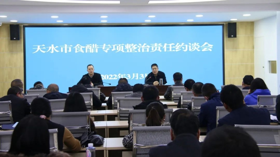 3月3日下午,省市场监管局组织召开全省食醋生产企业责任约谈视频会,通报2021年度全省食醋生产企业监督检查及监督抽检发现的问题。会后,天水市市场监督管理局组织召开全市食醋专项整治责任约谈会议,就下一步开展食醋专项整治进行了安排部署,市市场监管局党组成员王俊峰参加约谈会并讲话。全市23户食醋生产企业和部分食醋加工小作坊负责人、以及县区市场监管人员共47人参加了会议。