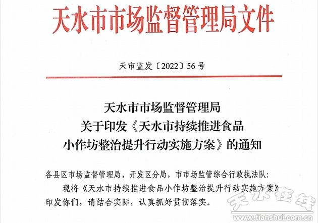 为进一步加强食品小作坊监管,切实保障人民群众舌尖上的安全,近日,天水市市场监管局制定印发了《天水市持续推进食品小作坊整治提升行动实施方案》,在食品小作坊综合治理三年提升(2019-2021)工作基础上,持续开展食品小作坊整治提升行动,防范风险、消除隐患,不断提升全市食品安全水平。
