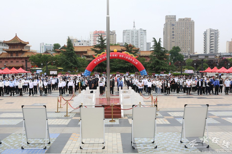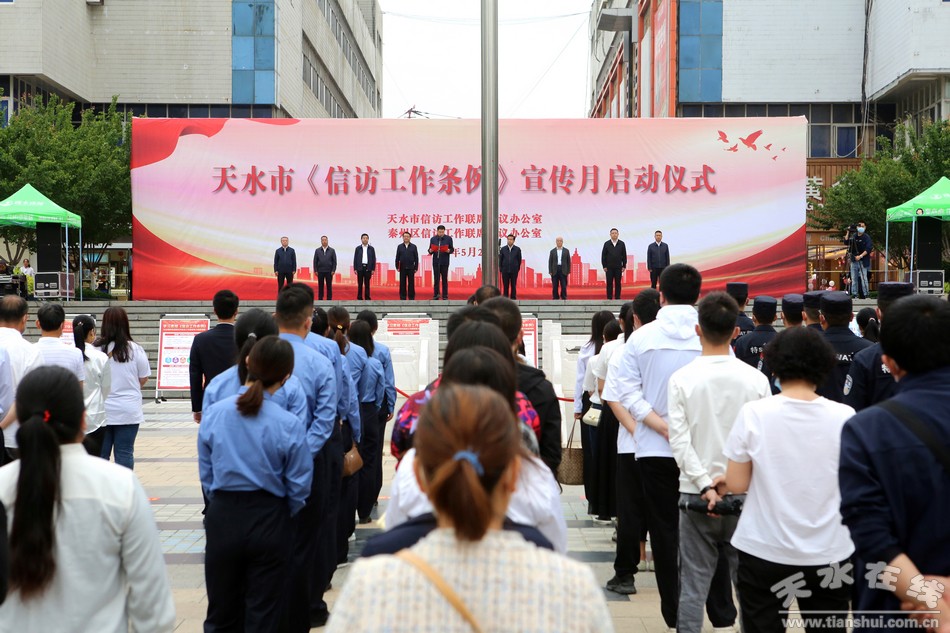 新天水讯【记者马凯】5月25日,以“贯彻信访工作新《条例》,坚持人民信访为人民”为主题的《信访工作条例》宣传月启动仪式在秦州区龙城广场举行。市委常委、政法委书记刘天波讲话并宣布全市宣传月活动正式启动,市人大常委会副主任索鸿宾。市政协副主席董仲奇出席活动,副市长、市公安局局长郭庆祥主持启动仪式。