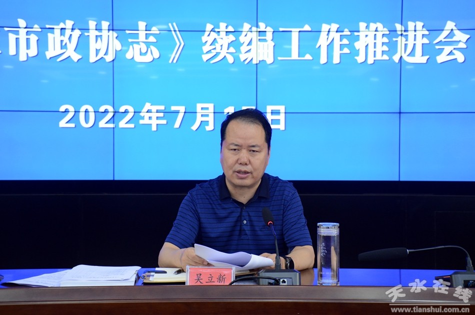7月15日,天水市政协召开《天水市政协志》续编工作推进会。市政协党组成员、副主席吴立新出席会议并讲话,市政协党组成员、秘书长董小明主持会议,市政协党组成员贾忠慧,市政协各委办主任、副主任参加会议,