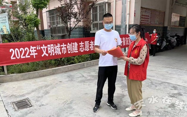 为推动我市志愿服务活动规范深入开展,积极培养广大志愿者“关爱他人、奉献社会”的社会责任感和公共道德,6月21日至7月10日,天水市民政系统开展了以“文明城市创建,志愿者在行动”为主题的普法宣传活动。