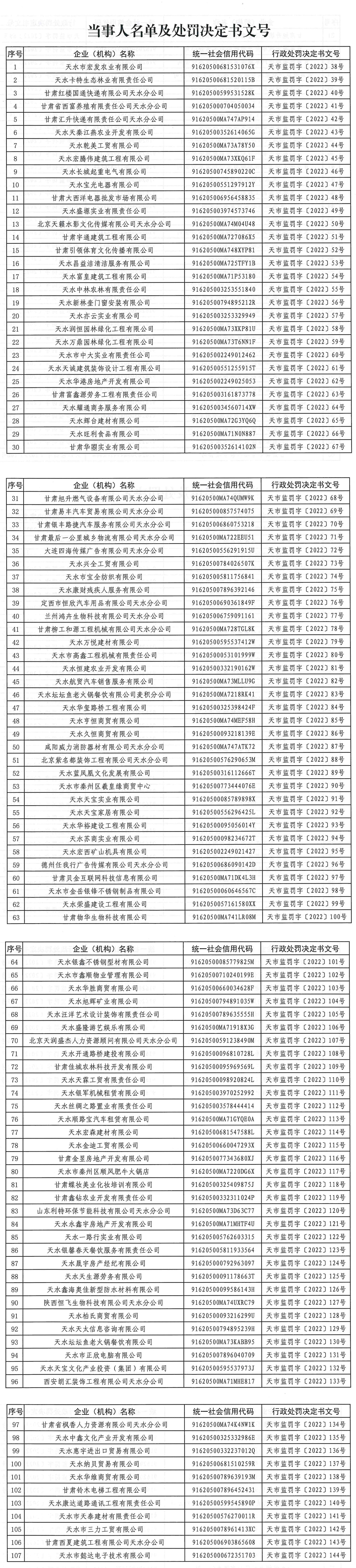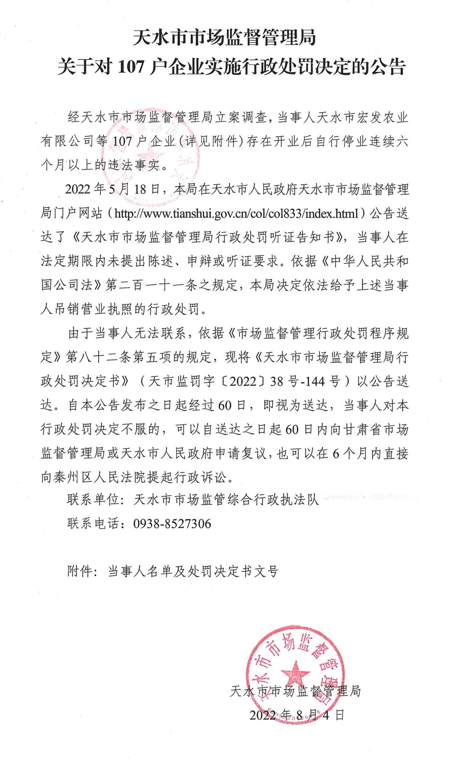 天水市市场监督管理局关于对107户企业实施行政处罚决定的公告(图)