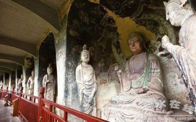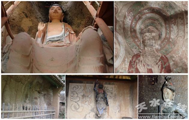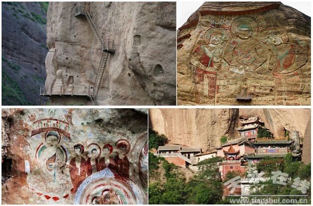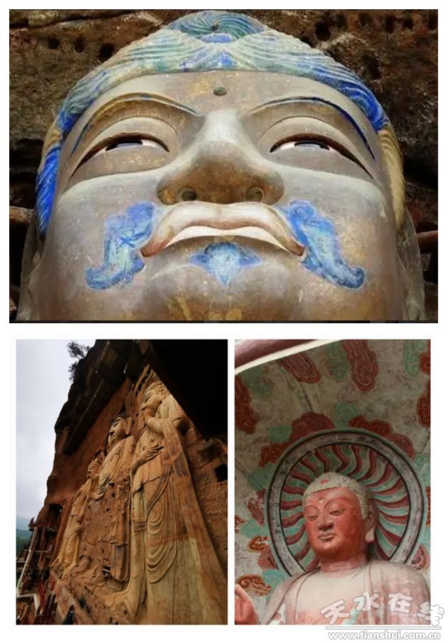 天水最具代表性的风景区麦积山景区内,“中国四大石窟”之一的麦积山石窟已在此伫立千年。麦积山石窟的艺术特点是以其精美的泥塑驰名中外。如果说甘肃另一个四大石窟之一的莫高窟是一个画展,那么麦积山石窟则是一座巨大的雕塑馆——各种姿态、造型、大小的泥塑和洞窟盘踞了麦积山表面近一半的面积,其整体规模和现存泥塑体量在国内石窟中领袖群伦,是名副其实的“东方雕塑艺术馆”。