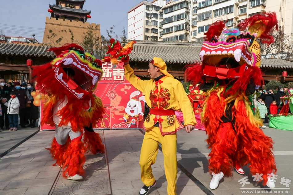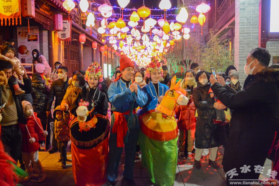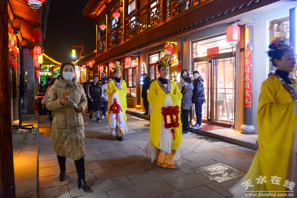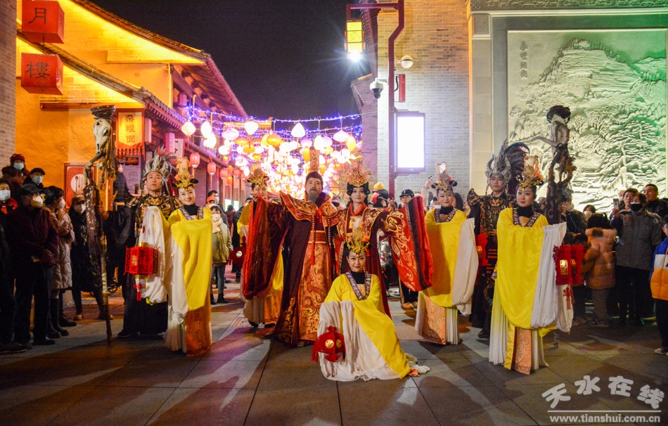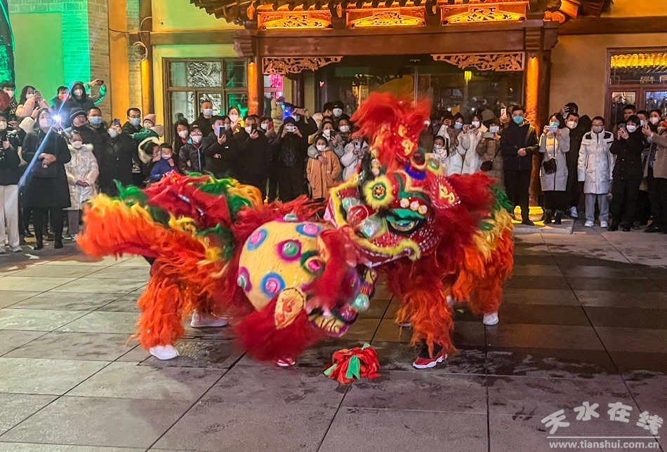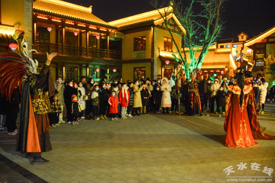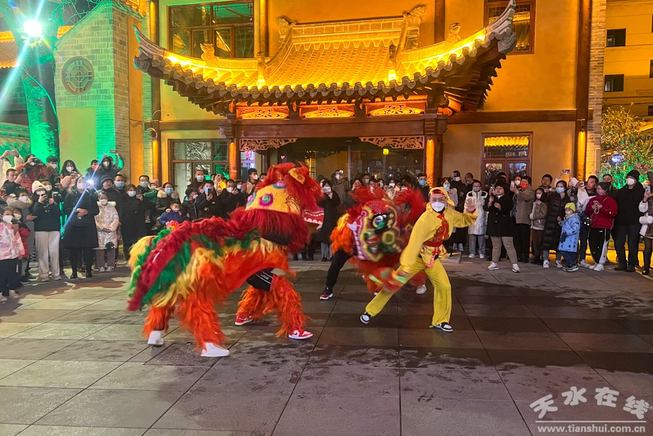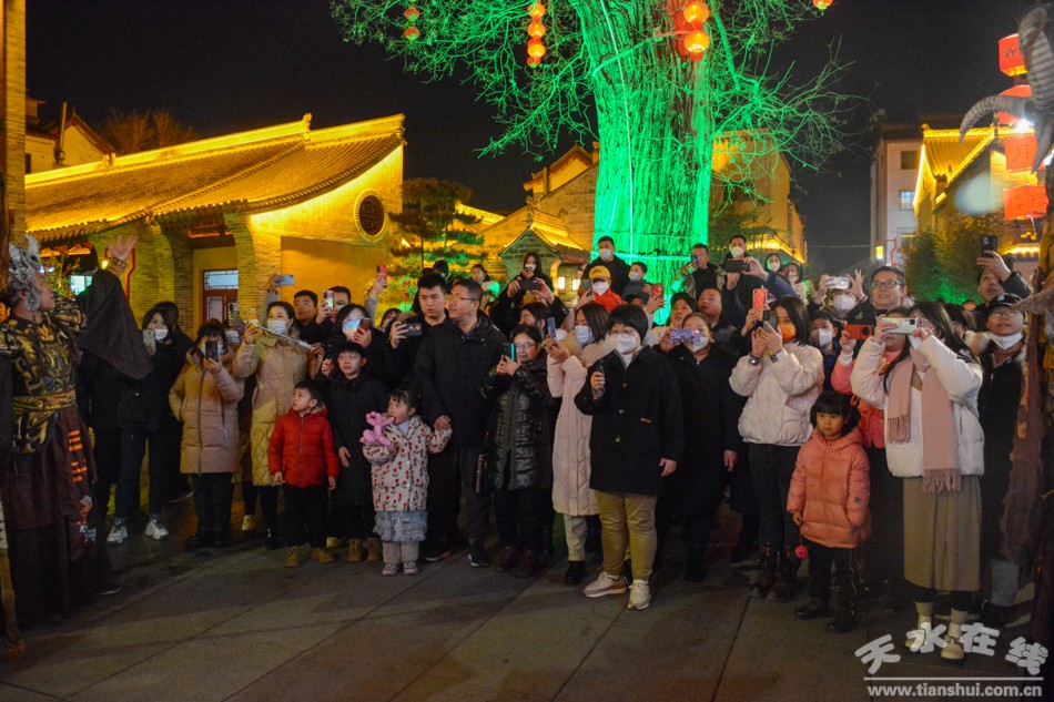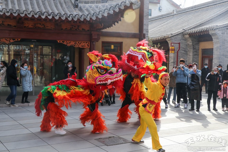1月25日(大年初四)下午和晚上,天水市歌舞团组织演艺团队到天水西关古城进行多种形式的文艺表演,吸引众多游客观看。演出节目涵盖非遗舞狮、旱船、毛驴秧歌、秦州小曲、祭祀汉服秀、乐舞表演、电声乐队、快闪舞蹈《梦回三国》《秦州夹板》等。