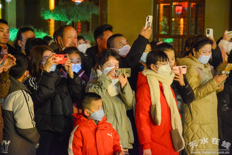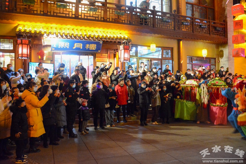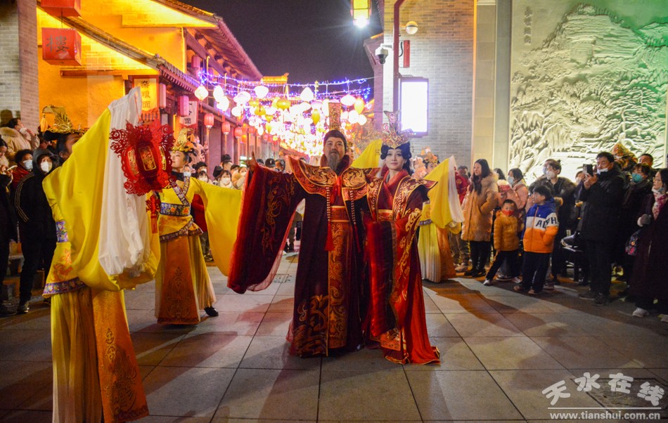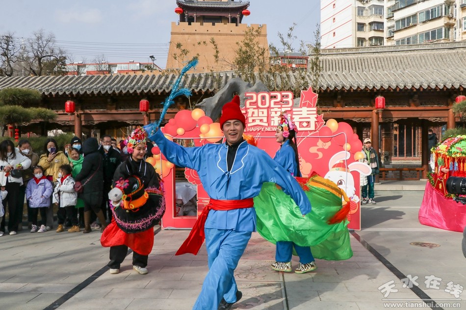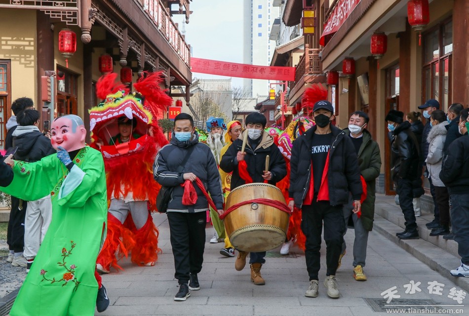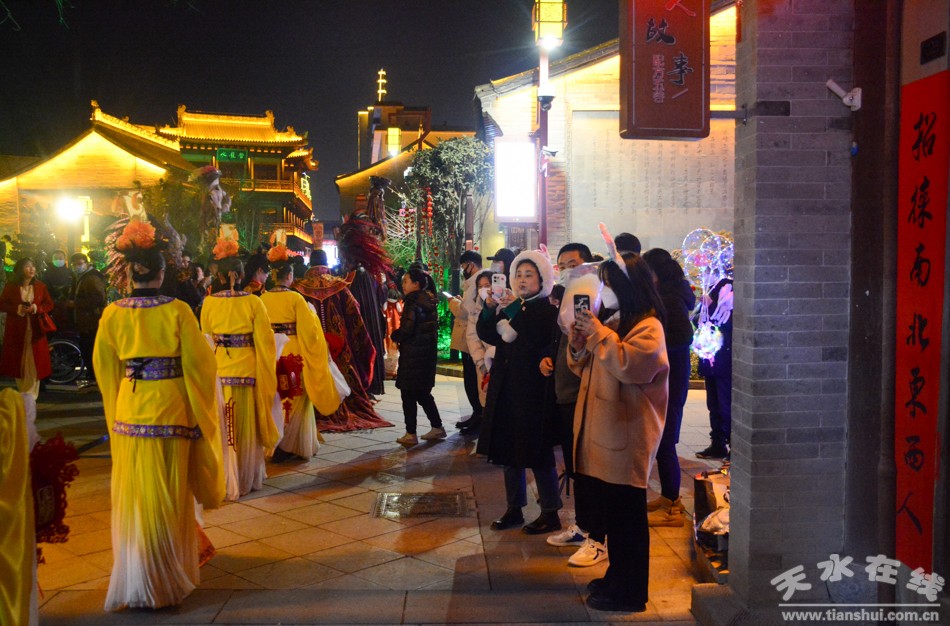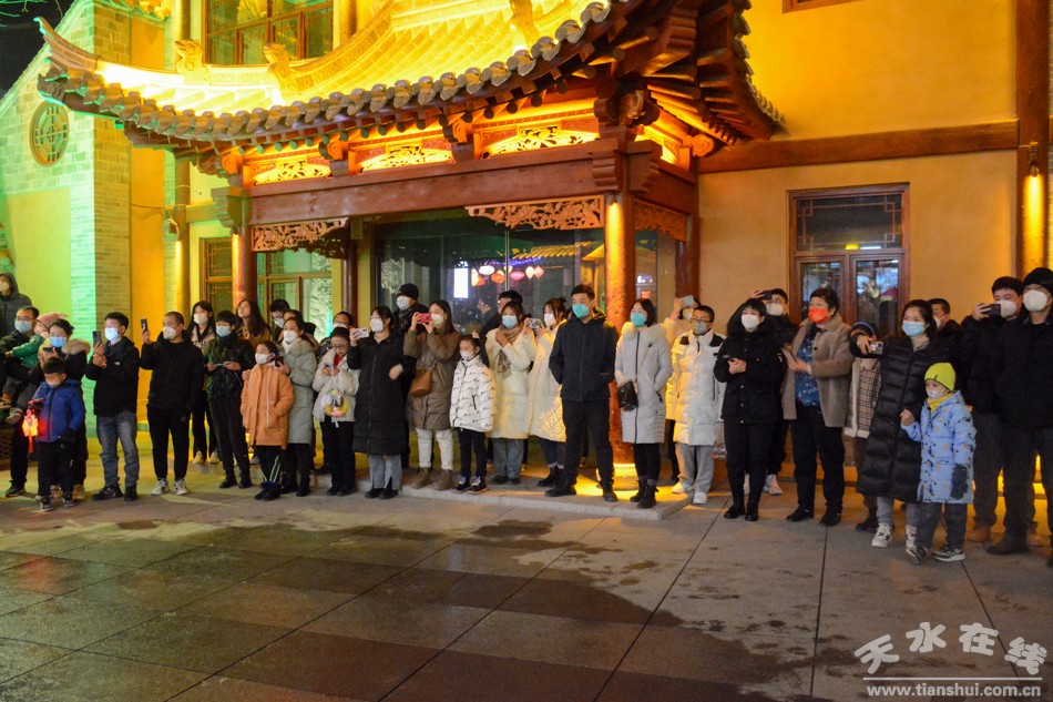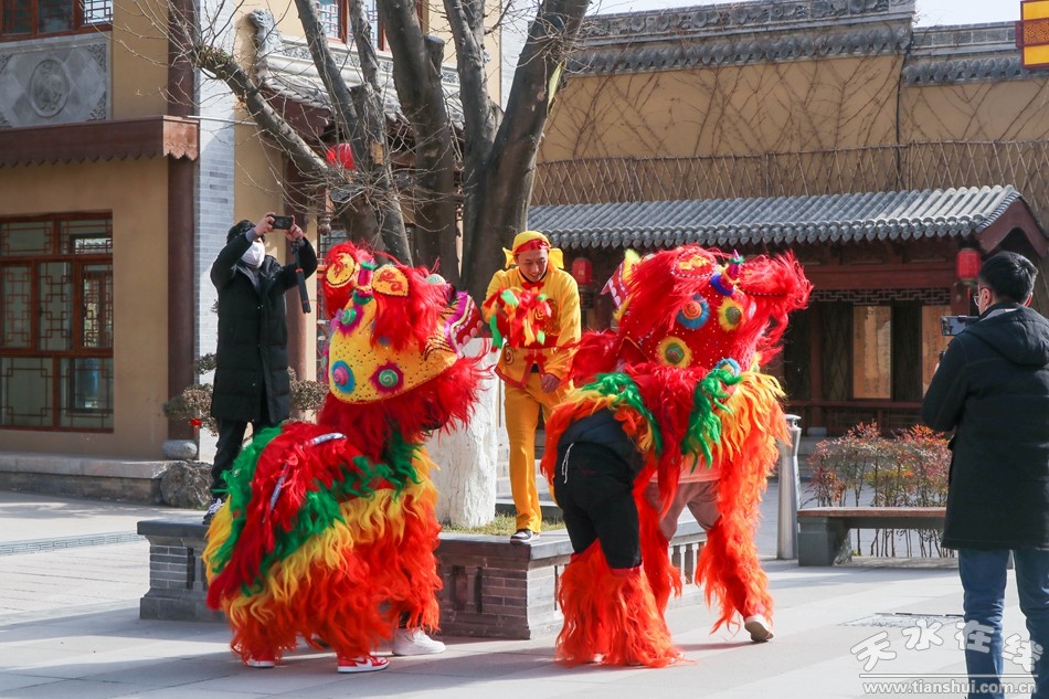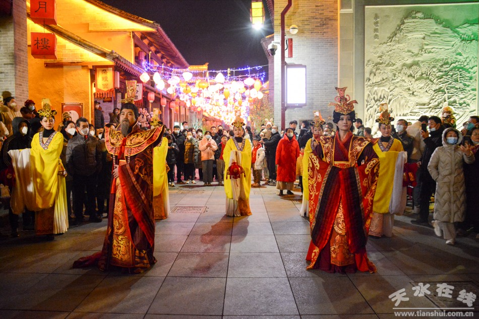 1月25日(大年初四)下午和晚上,天水市歌舞团组织演艺团队到天水西关古城进行多种形式的文艺表演,吸引众多游客观看。演出节目涵盖非遗舞狮、旱船、毛驴秧歌、秦州小曲、祭祀汉服秀、乐舞表演、电声乐队、快闪舞蹈《梦回三国》《秦州夹板》等。