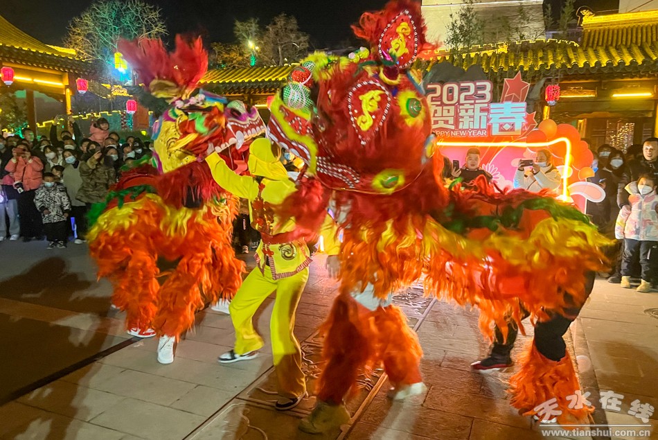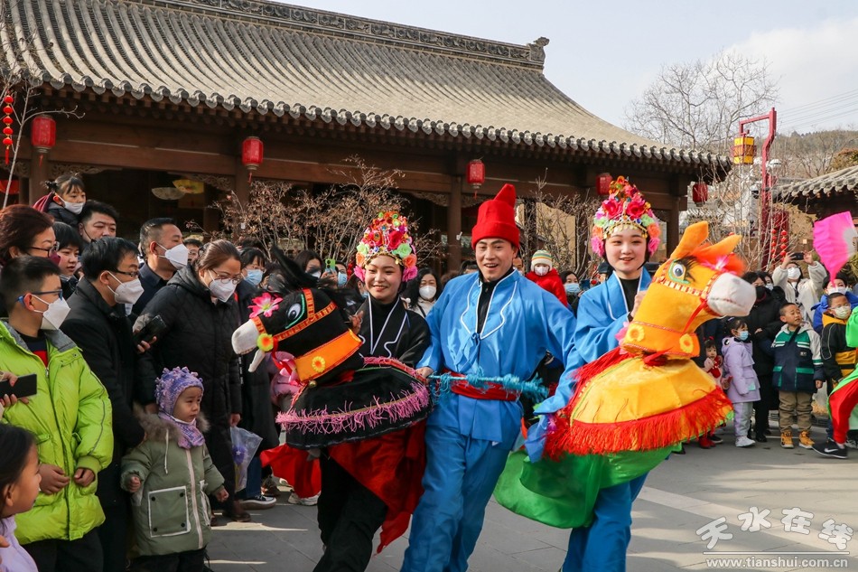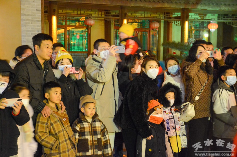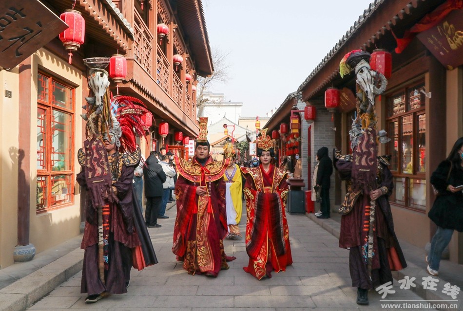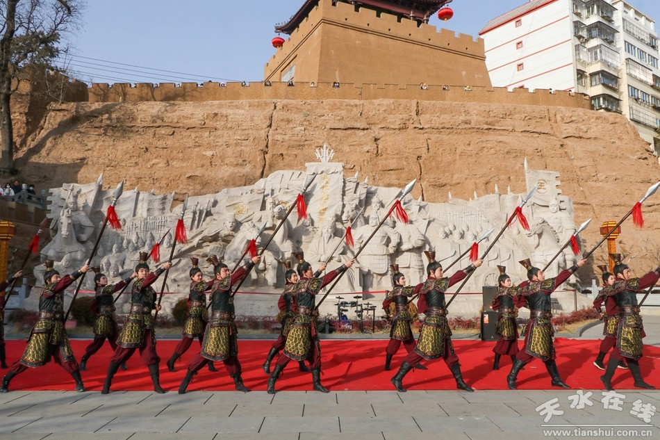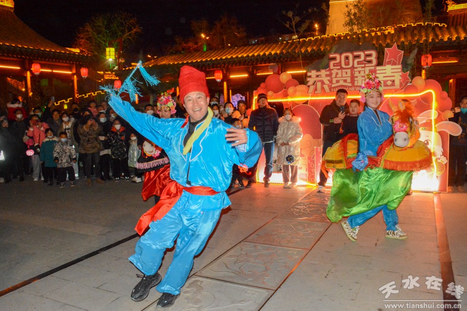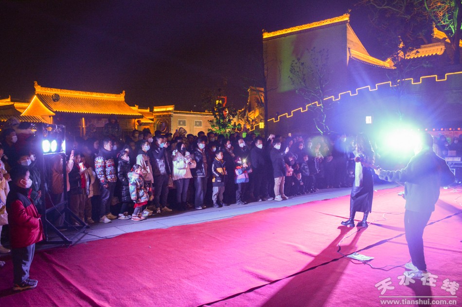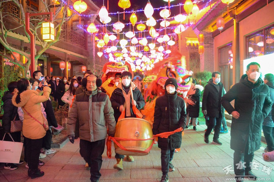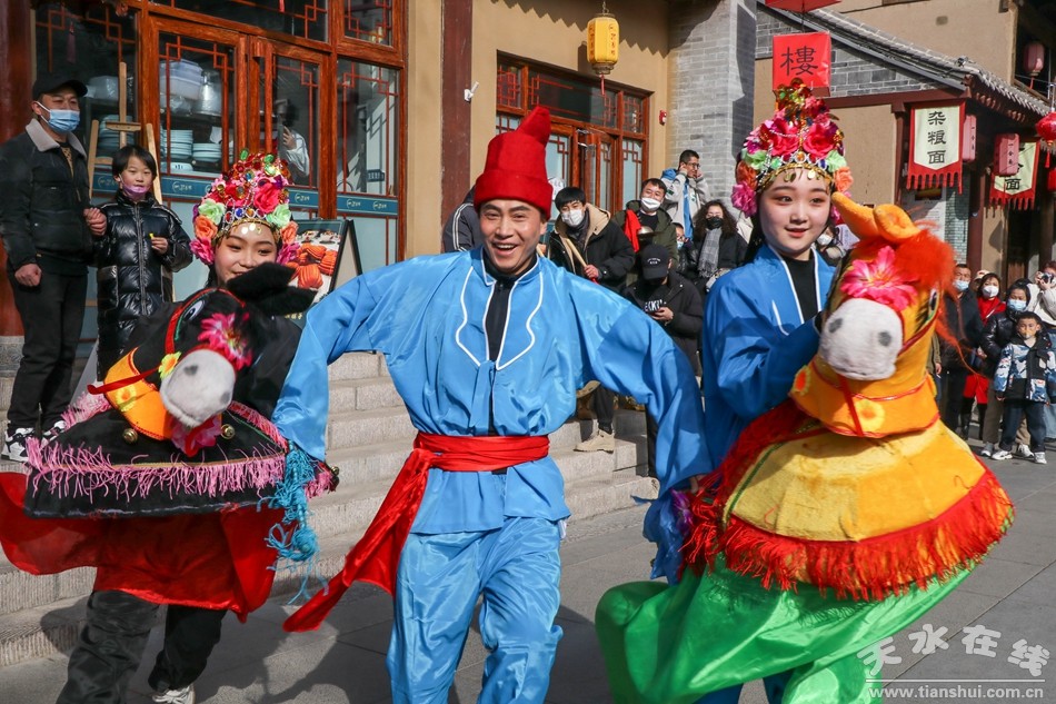 1月25日(大年初四)下午和晚上,天水市歌舞团组织演艺团队到天水西关古城进行多种形式的文艺表演,吸引众多游客观看。演出节目涵盖非遗舞狮、旱船、毛驴秧歌、秦州小曲、祭祀汉服秀、乐舞表演、电声乐队、快闪舞蹈《梦回三国》《秦州夹板》等。