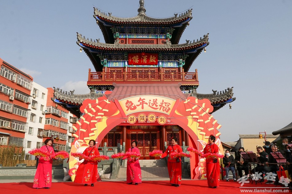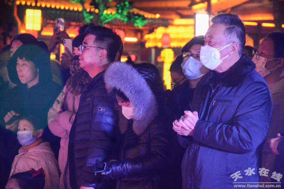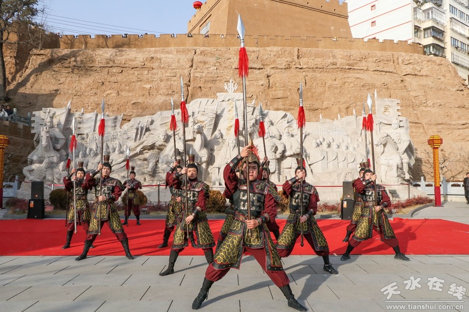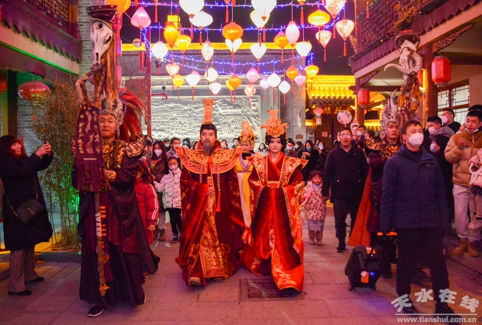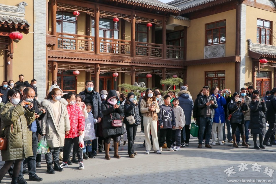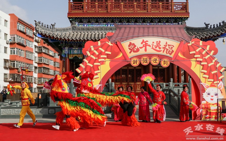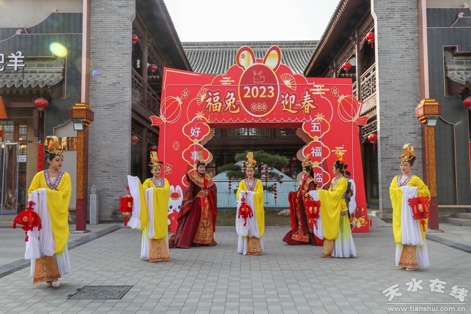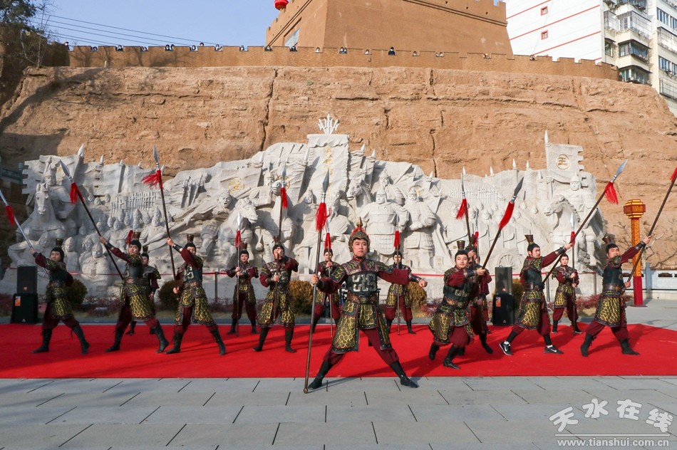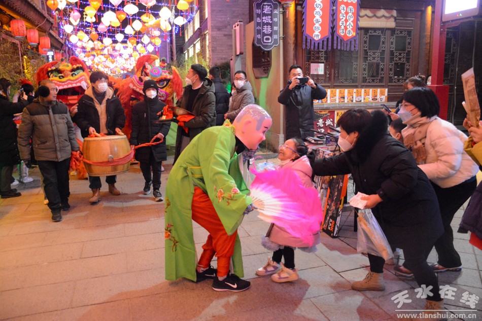 1月25日(大年初四)下午和晚上,天水市歌舞团组织演艺团队到天水西关古城进行多种形式的文艺表演,吸引众多游客观看。演出节目涵盖非遗舞狮、旱船、毛驴秧歌、秦州小曲、祭祀汉服秀、乐舞表演、电声乐队、快闪舞蹈《梦回三国》《秦州夹板》等。