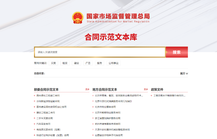 近日,由国家市场监管总局开发建设的全国合同示范文本库正式上线,“全国合同示范文本库”包括“部委合同示范文本”和“地方合同示范文本”两个分类,收录了国家市场监管总局以及各省级市场监管部门制定发布的大量合同示范文本。目前已收录各类合同示范文本近500种,面向社会免费开放。