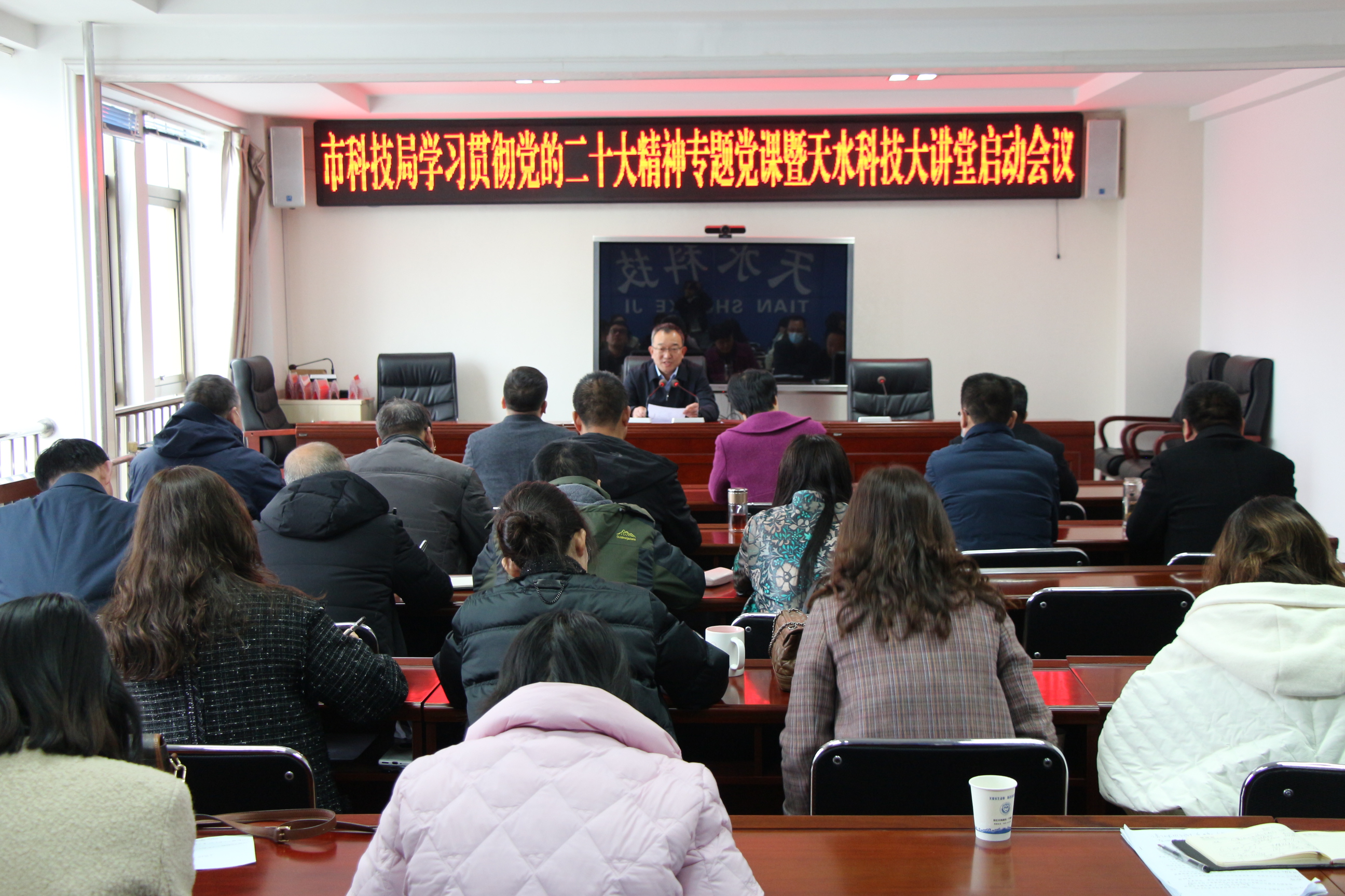 3月24日,市科技局召开学习贯彻党的二十大精神专题党课暨天水科技大讲堂启动会议,局党组书记薛林荣围绕学习贯彻党的二十大对科技创新工作的新部署新要求,以《聚焦科技创新“关键变量”实施强科技行动,为建设区域中心城市提供“最大增量”》为题,为全局干部职工上了一堂生动的党课,同时启动了天水科技大讲堂。